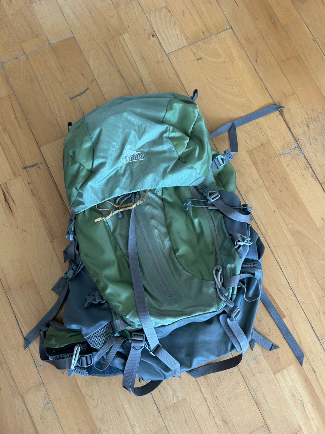 Selling a Gregory Jade 60 backpack in great condition! It's a comfortable and reliable backpack perfect for hiking or travel. The colour is a nice green and grey combination. Great for all your adventures! I just washed it before listing it.