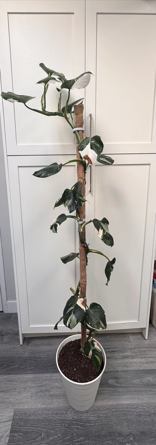 Selling a beautiful Philodendron White Wizard plant in a white pot with stake.