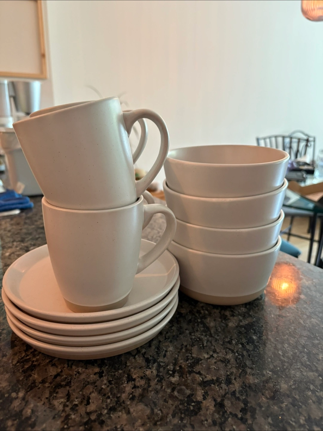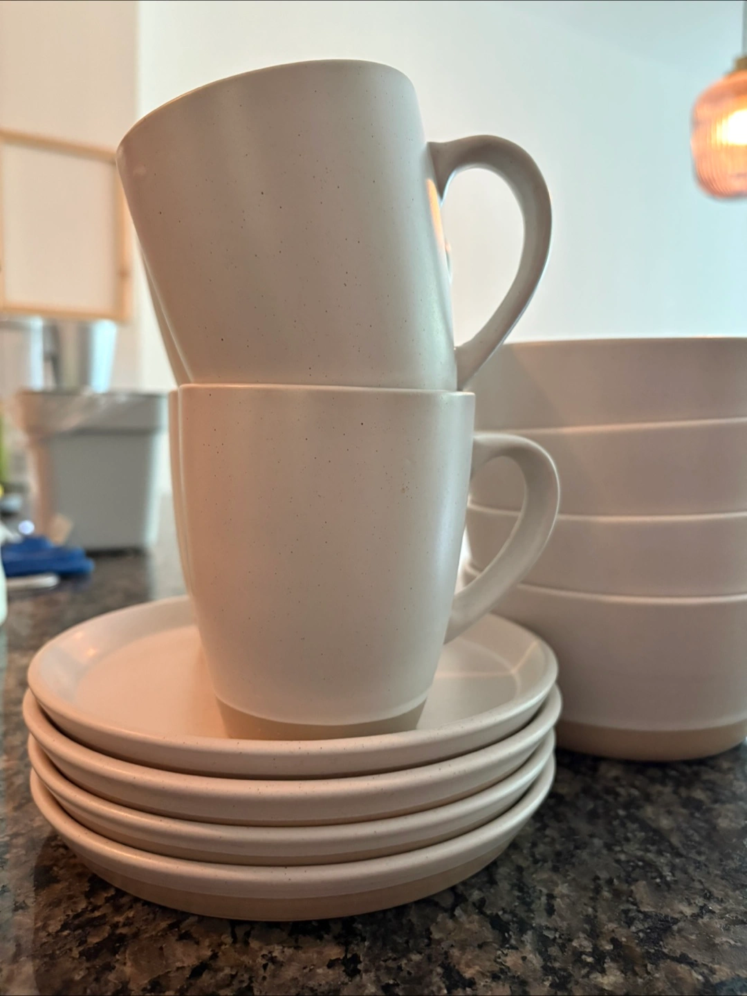 I have 8 x bowls, 8 x small plates, and 8 x mugs. They are in great condition and ready for a new home. No chips or dents. Typical sign of wear - if you take a look at the later picture you can see some minor scratches at the bottom of the bowl/plate from cutlery. Last slides have measurements for diameter.