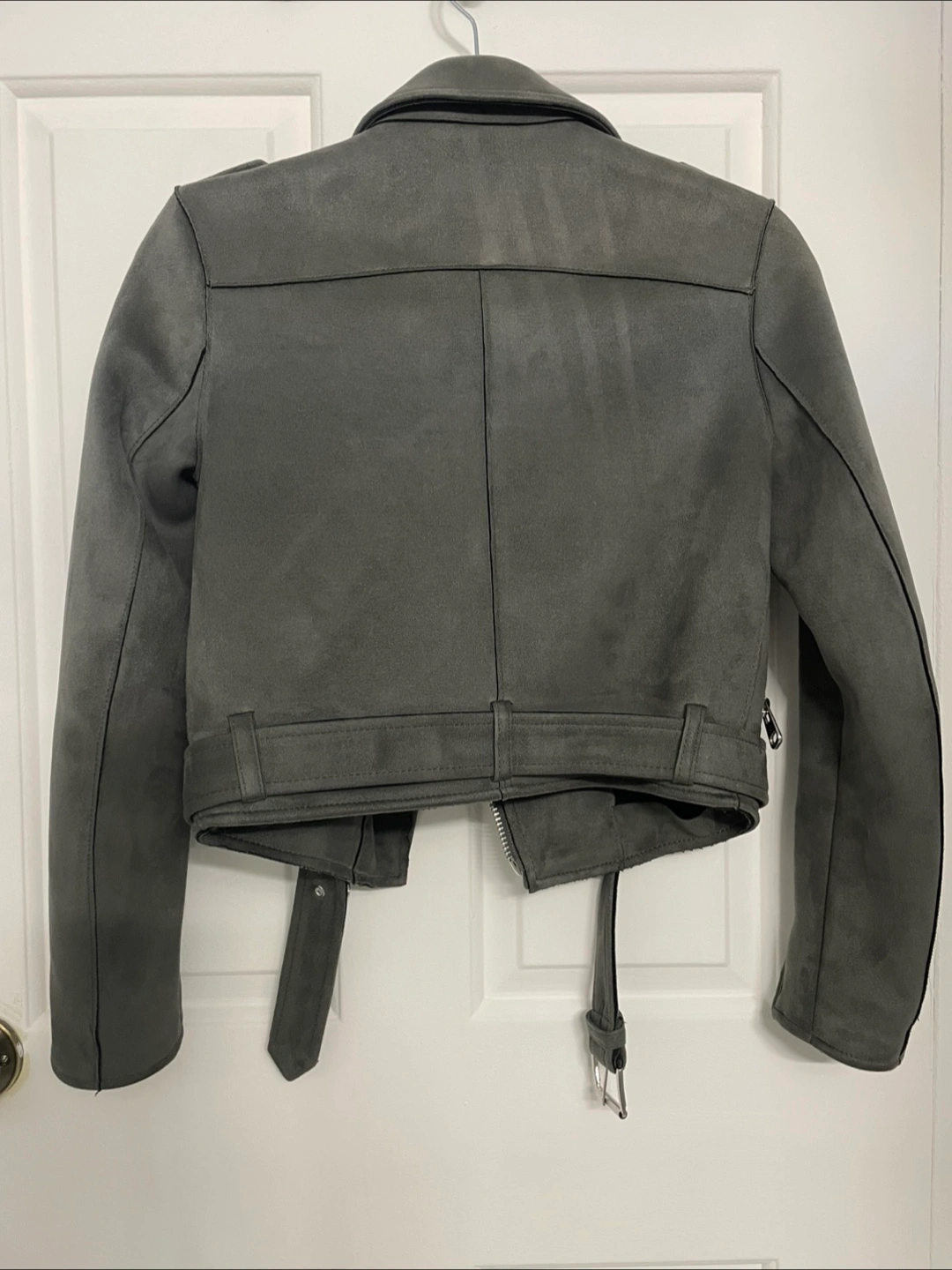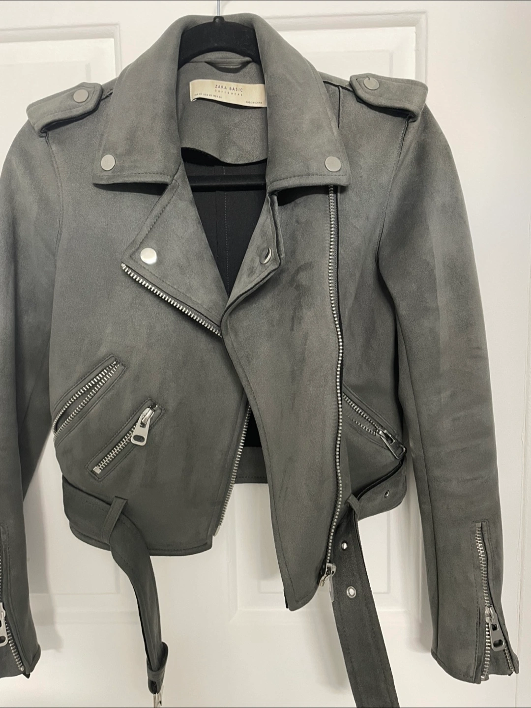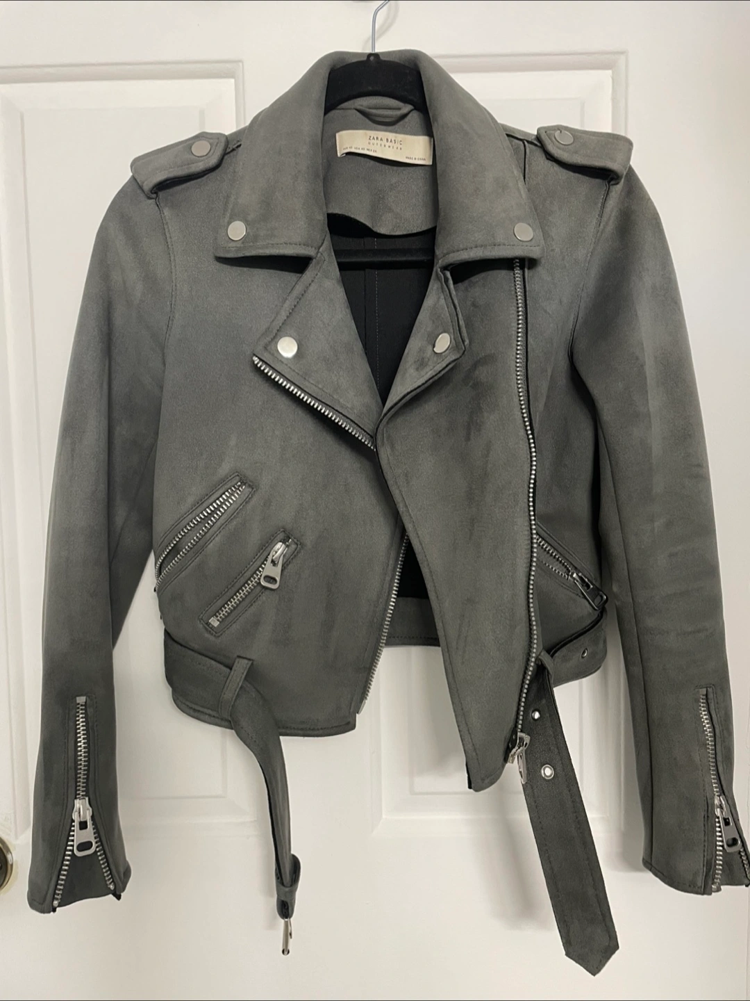 Selling a Zara Basic biker jacket in size XS. Gray colour, with silver zippers and snaps. Fits true to size. No flaws or damage. Great for Fall!