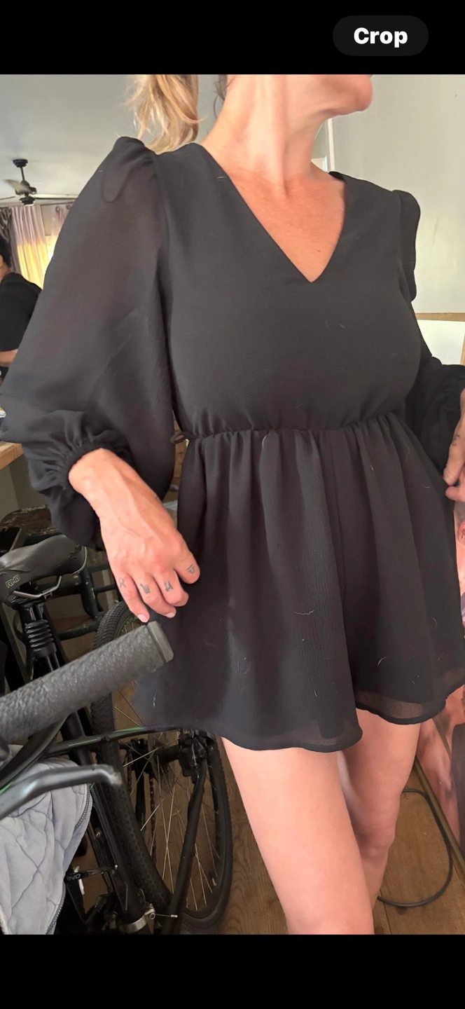 A cute black mini dress with a v-neck and long, slightly puffed sleeves. It's a size small and would be perfect for a night out or a casual day with some cute sandals. It's in great condition!