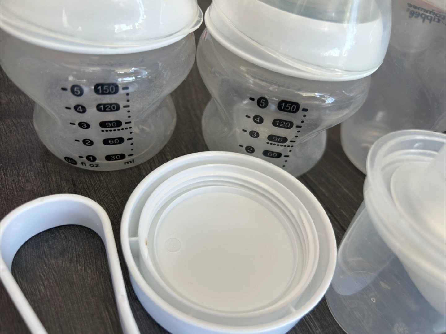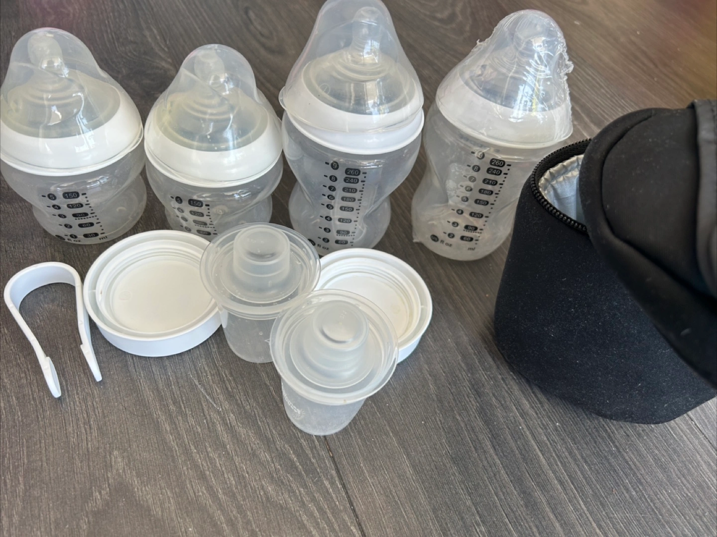 Selling a set of Tommee Tippee baby bottles along with an insulated carrier! These bottles are perfect for feeding your little one, and the carrier makes it easy to bring them on the go. They're in great condition and ready for a new home