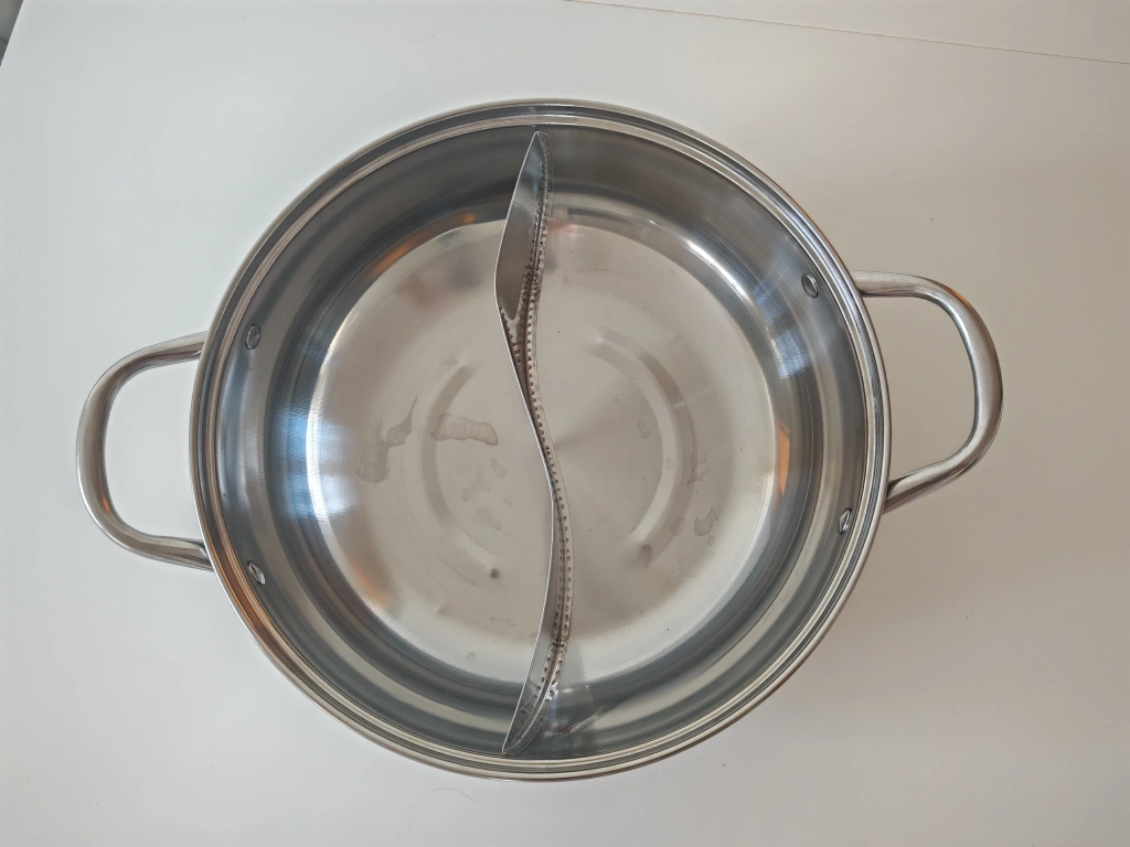 Selling a brand new stainless steel hot pot, perfect for your next gathering! It measures 28cm in diameter and features a convenient divider for different broths or flavours. No lid included.