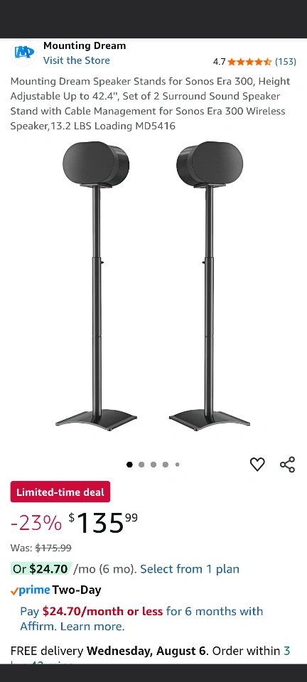 Selling a pair of Sonos Era 300 speaker stands. They are in excellent condition and ready to enhance your listening experience. The stands are height adjustable up to 42.4 inches. The original box is included!