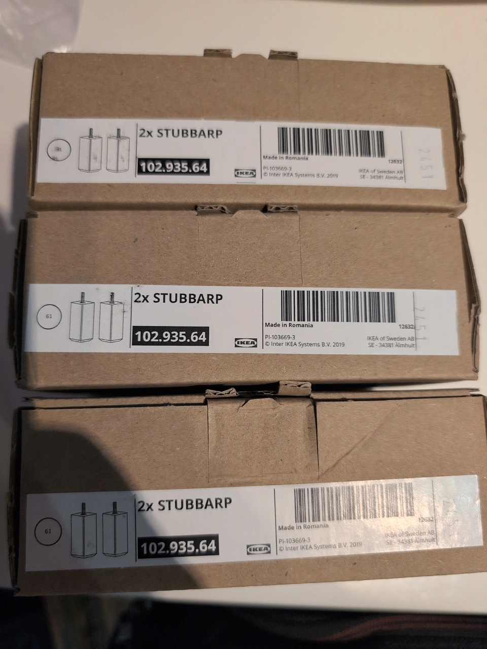 Selling six IKEA Stubbarp legs in white. They're brand new and still in their original packaging. Perfect for adding a bit of height to your furniture