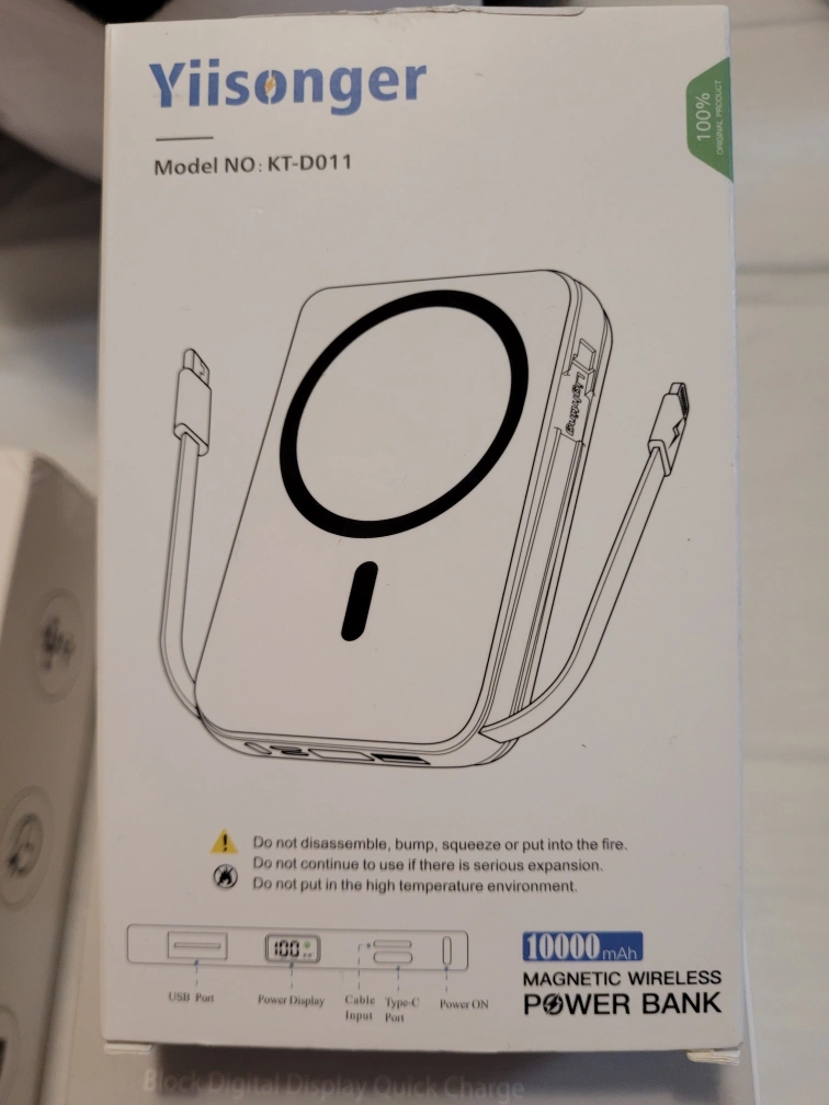 Selling a Yiisonger KT-D011 magnetic wireless power bank! It has a 10000 mAh capacity. The box includes the power bank itself, which features a USB port, power display, Type-C input port, and a power button. Perfect for charging your devices on the go!