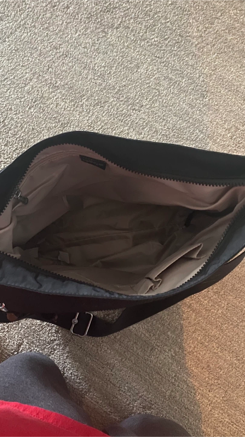 This Kipling shoulder bag is made of durable black nylon. It features multiple pockets for organization. The adjustable strap ensures comfortable wear.