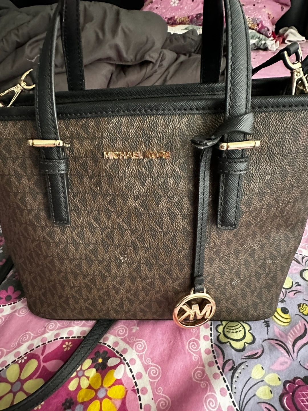 87Selling a bundle of two handbags! One is a Michael Kors handbag with the classic MK logo pattern. The other is a Calvin Klein handbag in black. Both are in good condition and ready for a new home