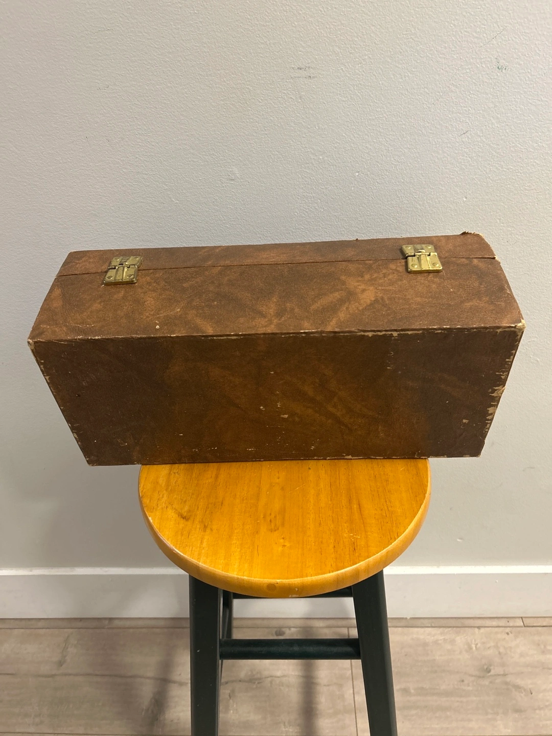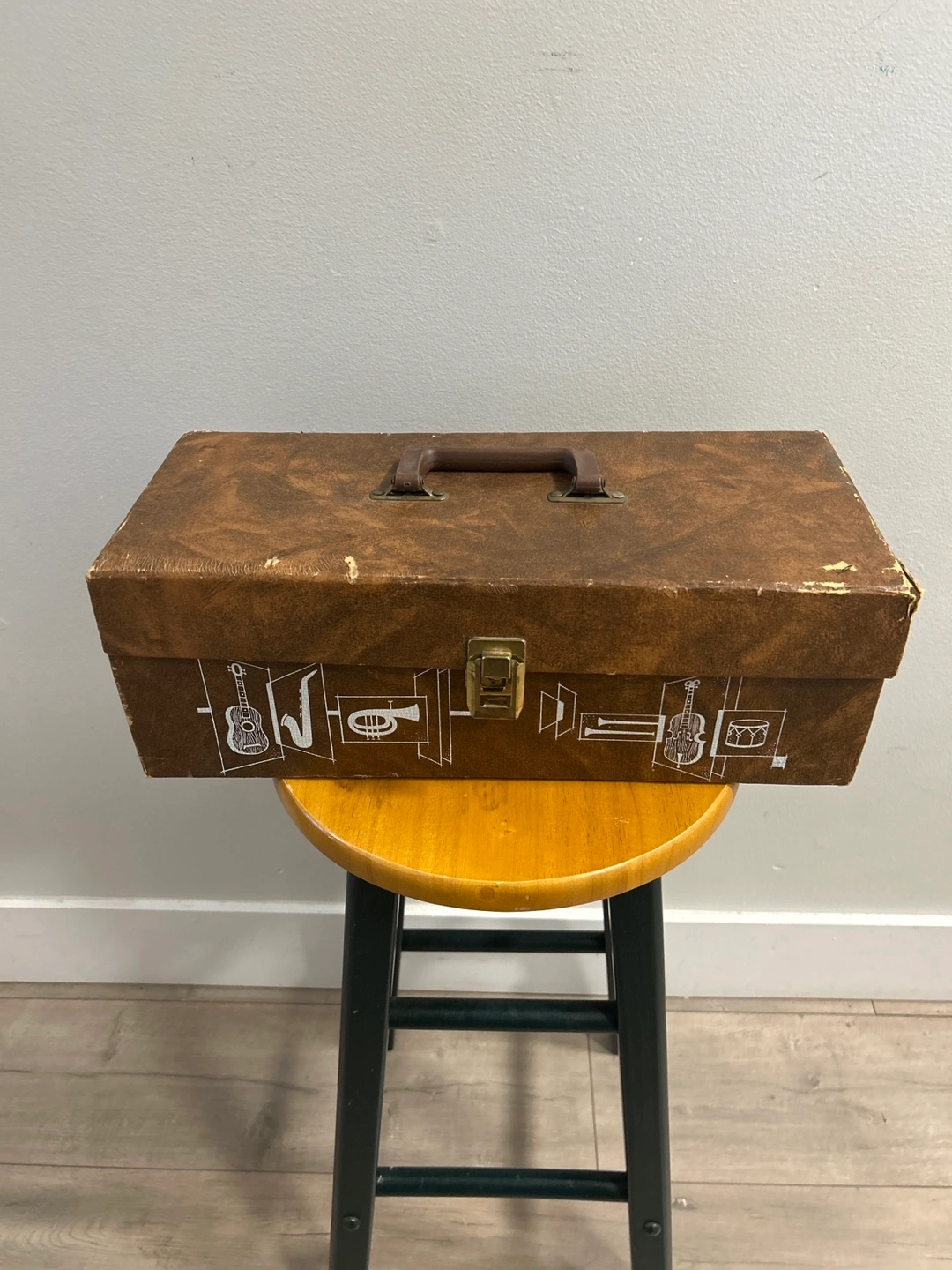Here's a vintage brown storage box, perfect for storing 8 tracks It features a musical instrument design on the exterior and a handle for easy carrying. The interior is lined in red. It shows some signs of wear and tear, adding to its vintage charm including all 8 tracks (24)