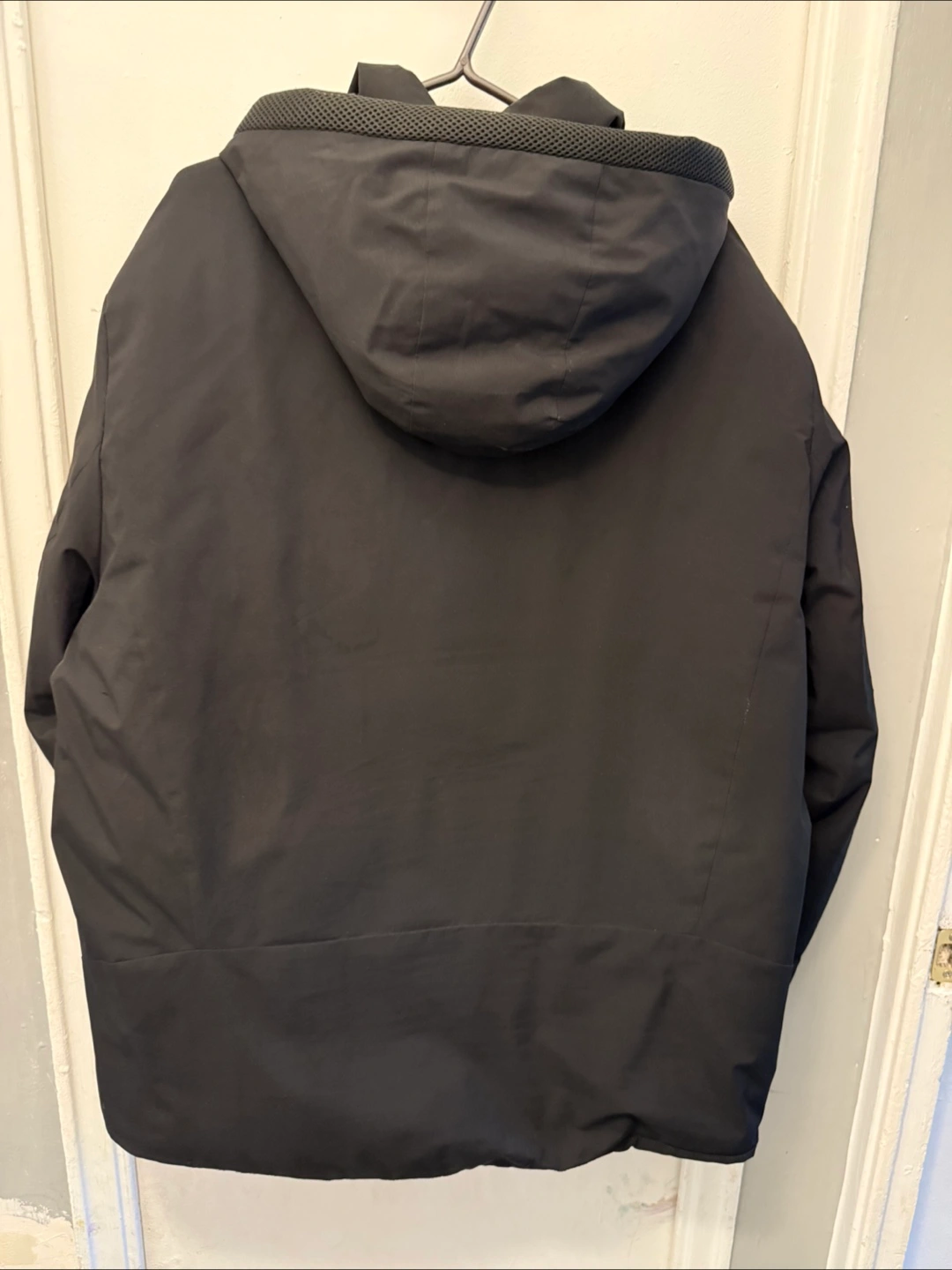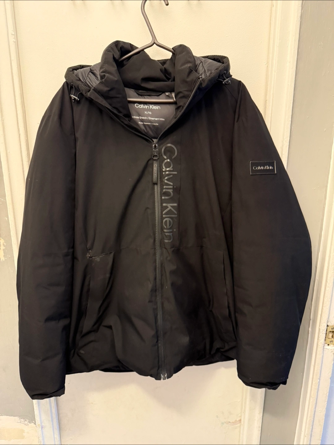 Selling a Calvin Klein puffer jacket in size XL. It's a sleek black colour and has a hood. The jacket features 'Infinite Stretch / Extremely Infinite' technology. Great for staying warm and stylish!