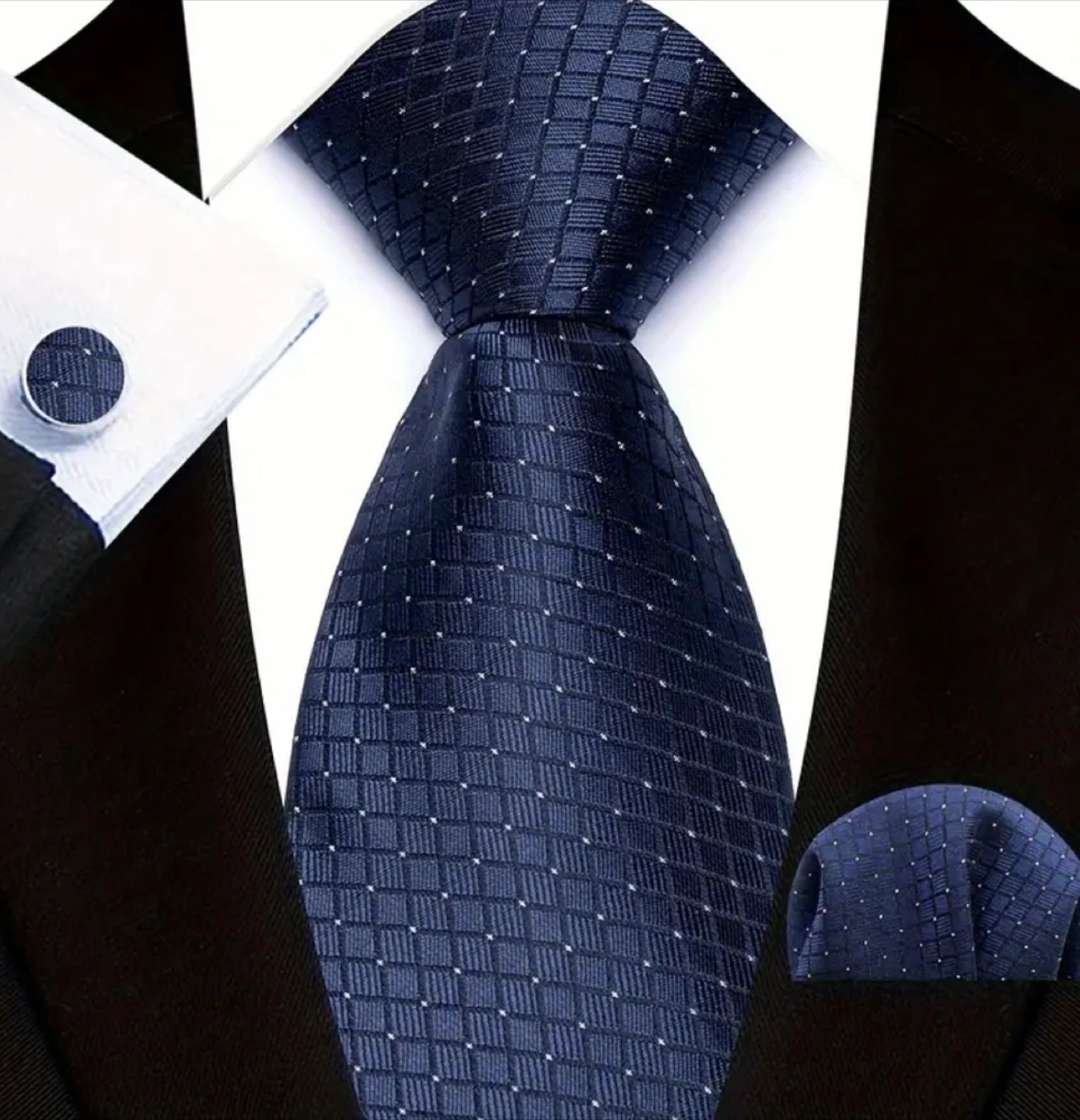 Selling a stylish navy blue tie, complete with matching cufflinks and a pocket square. This set is perfect for adding a touch of sophistication to any suit. Great for special occasions or professional wear!