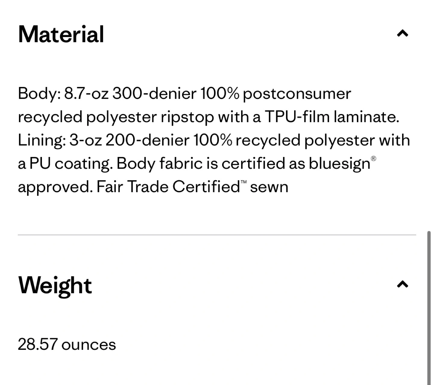 - Body: 8.7-oz 300-denier 100% postconsumer recycled polyester ripstop with a TPU-film laminate