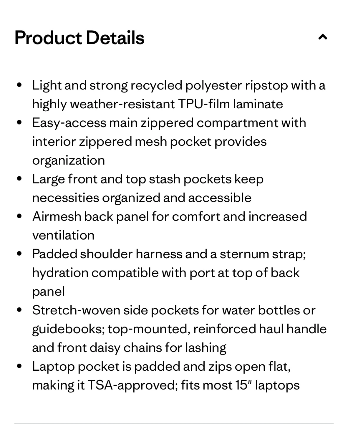 This pack is light and strong, featuring recycled polyester ripstop with a highly weather-resistant TPU-film laminate. It also has an easy-access main zippered compartment with interior zippered mesh pocket for organization, plus large front and top stash pockets to keep necessities organized and accessible