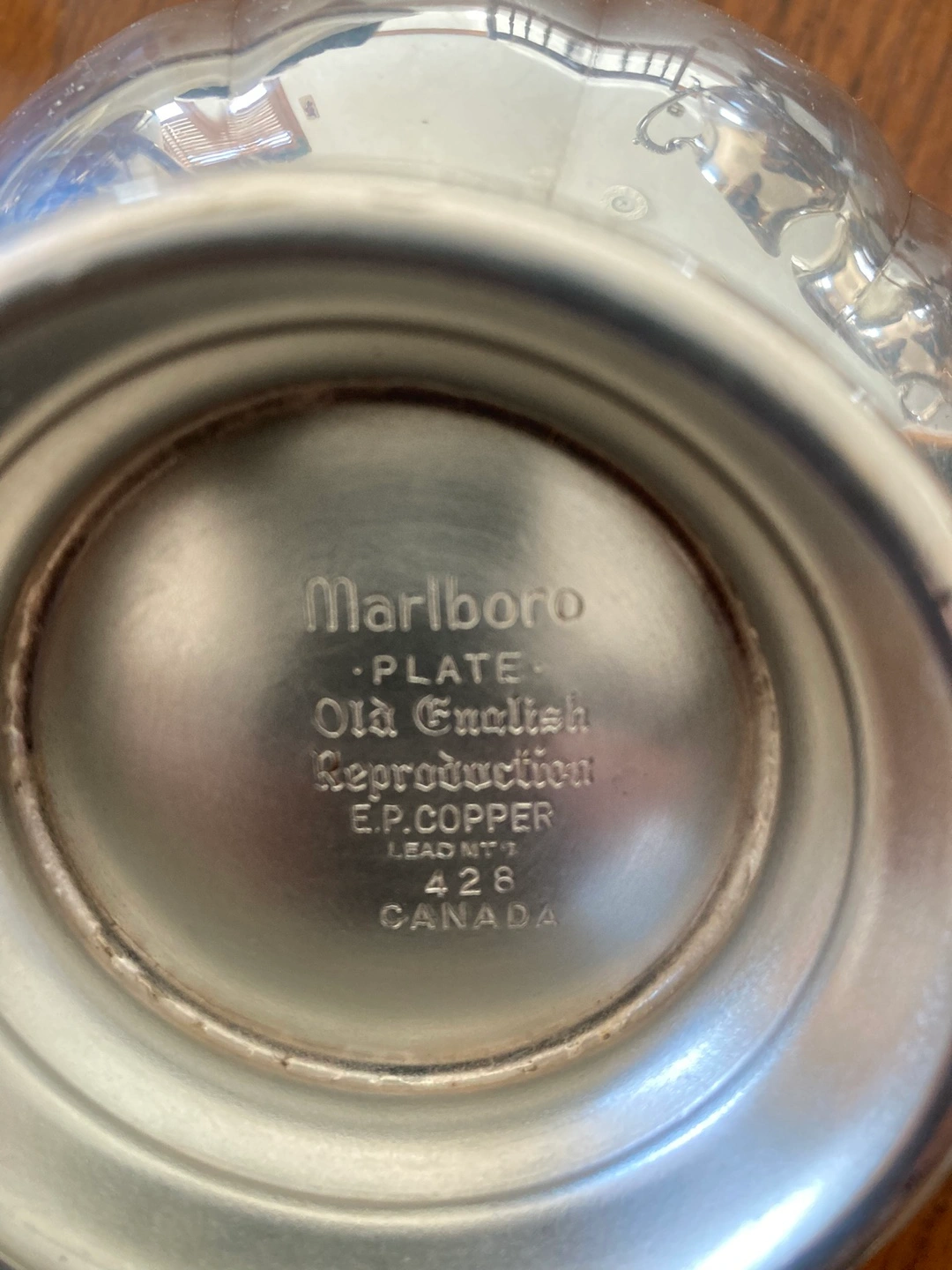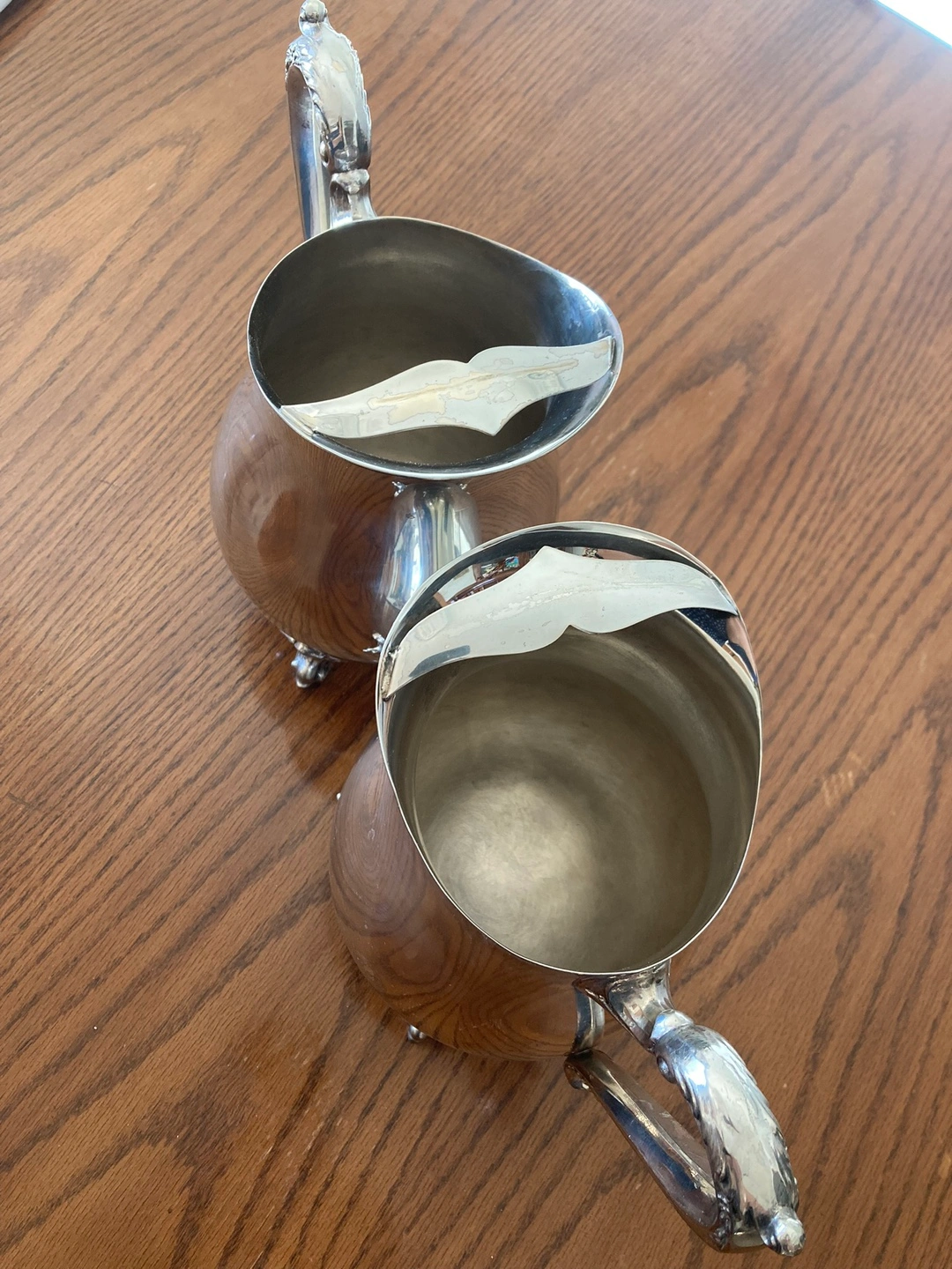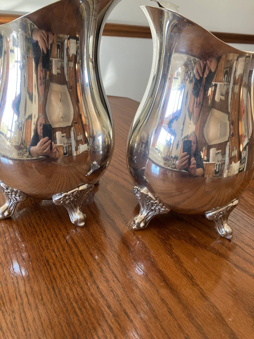 Selling a pair of Marlboro Plate pitchers, Old English Reproduction style. They are silver in colour and have a classic, elegant design. Perfect for serving beverages or as decorative pieces for your home!