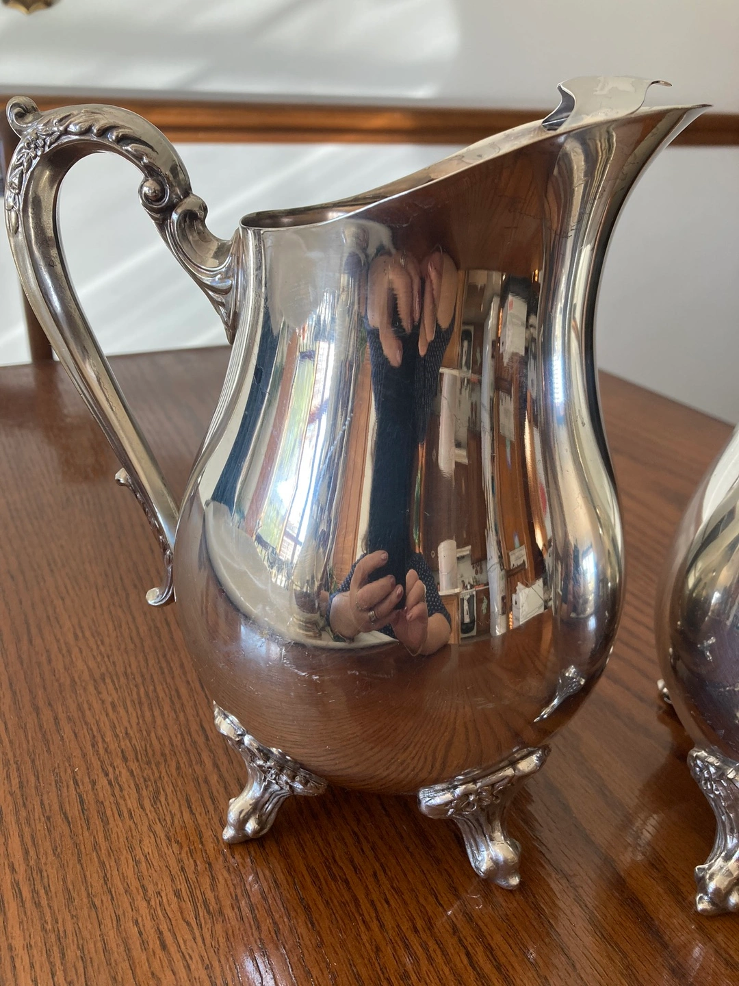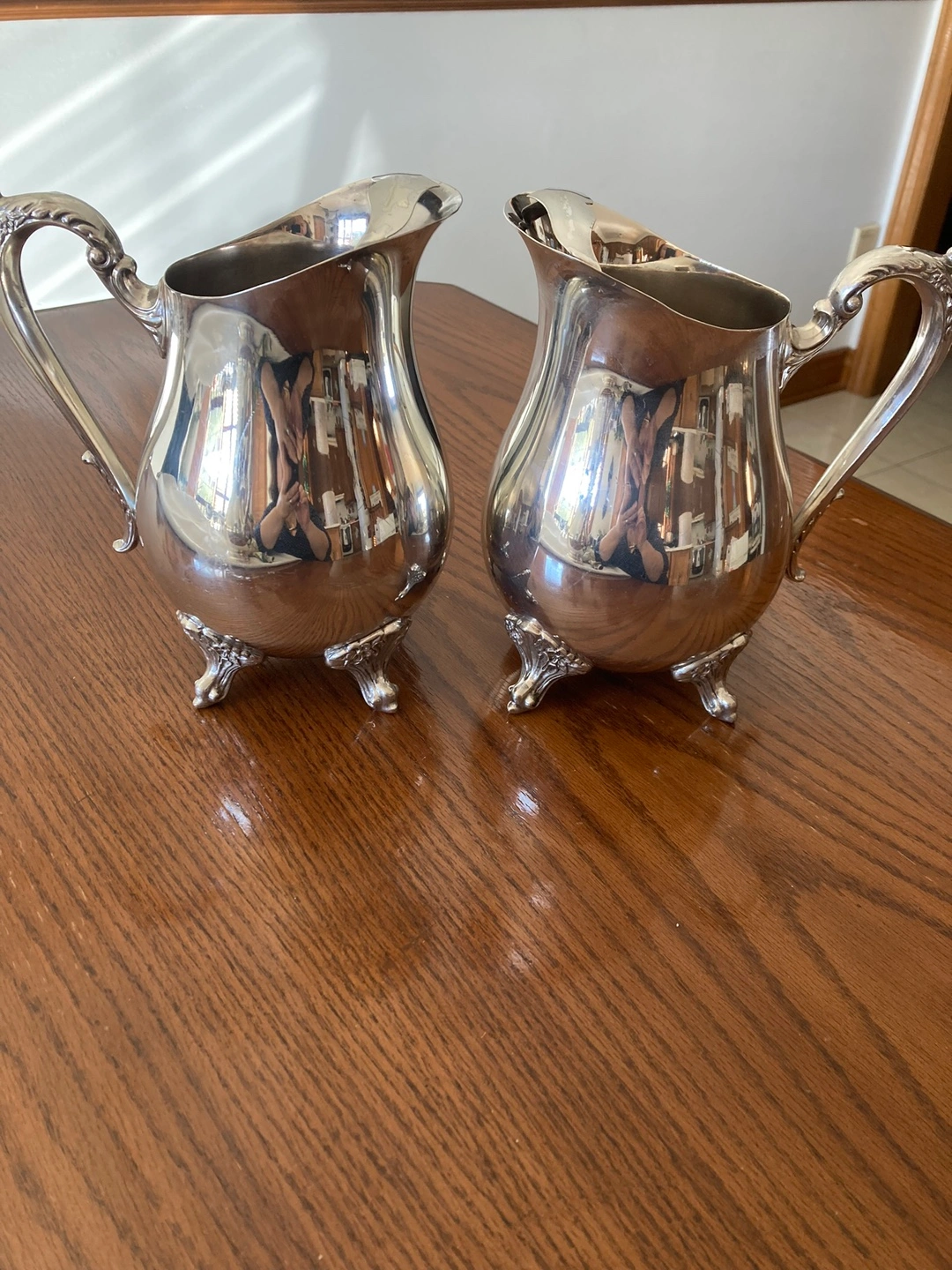 Selling a pair of Marlboro Plate pitchers, Old English Reproduction style. They are silver in colour and have a classic, elegant design. Perfect for serving beverages or as decorative pieces for your home!