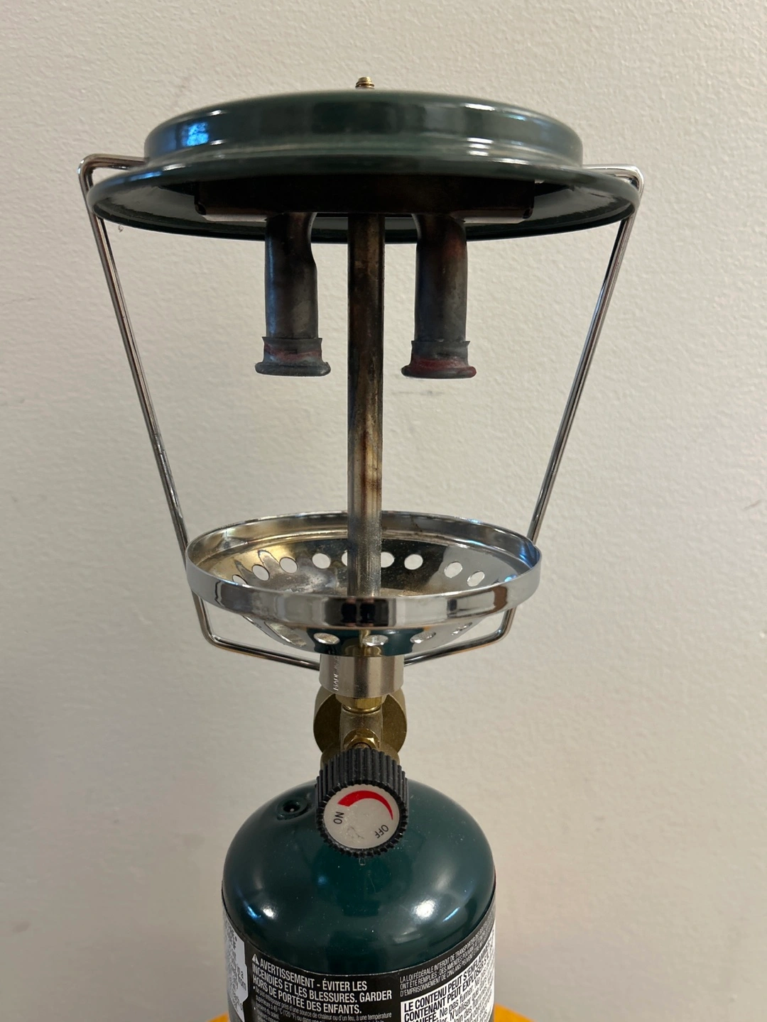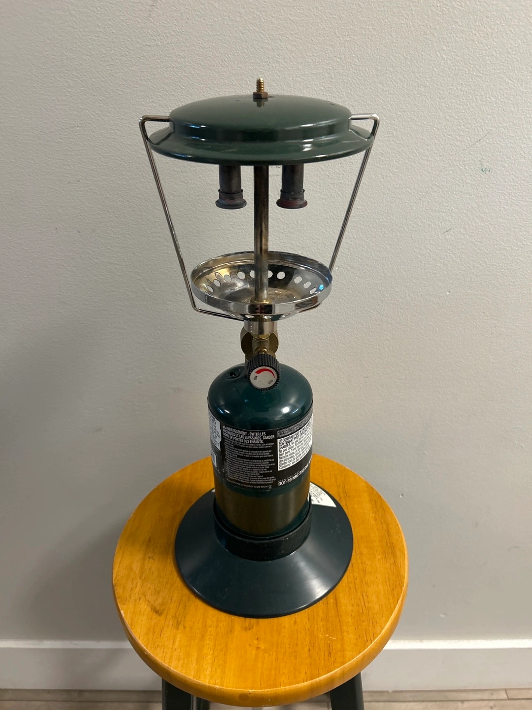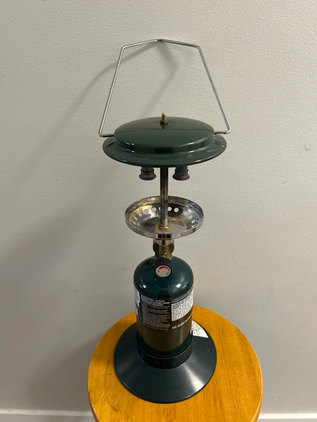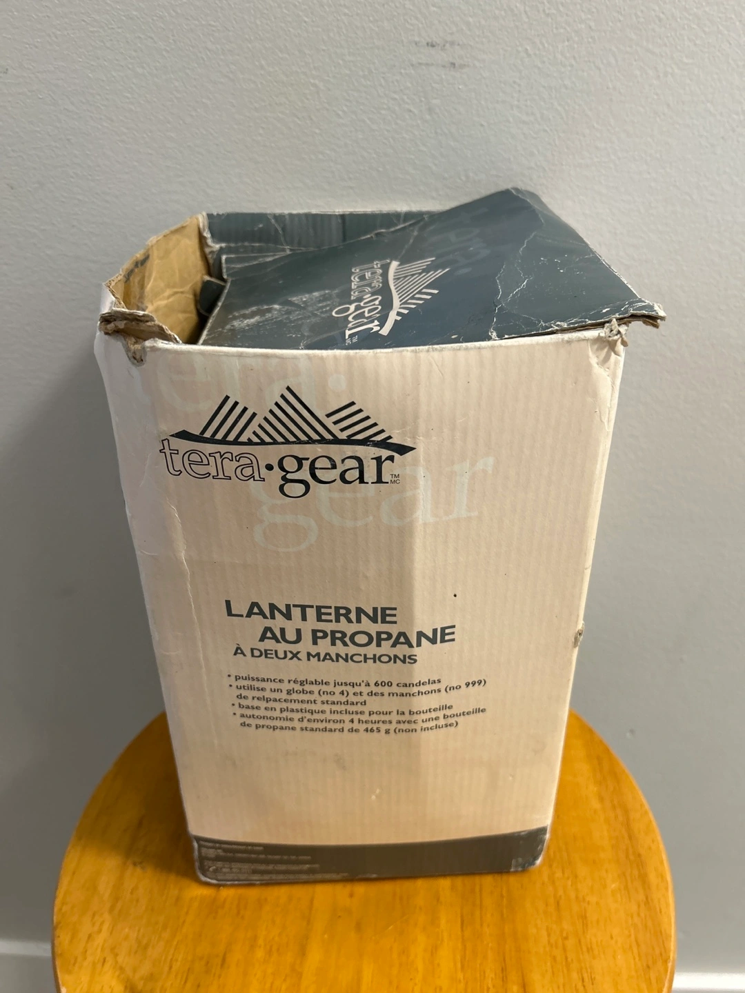 Selling a Tera Gear propane lantern. It uses a standard 465g propane bottle (not included). The box is included, though it's a little beat up. Brand new glass is included.