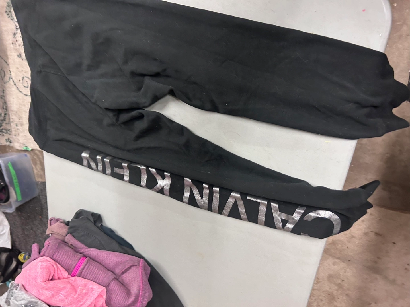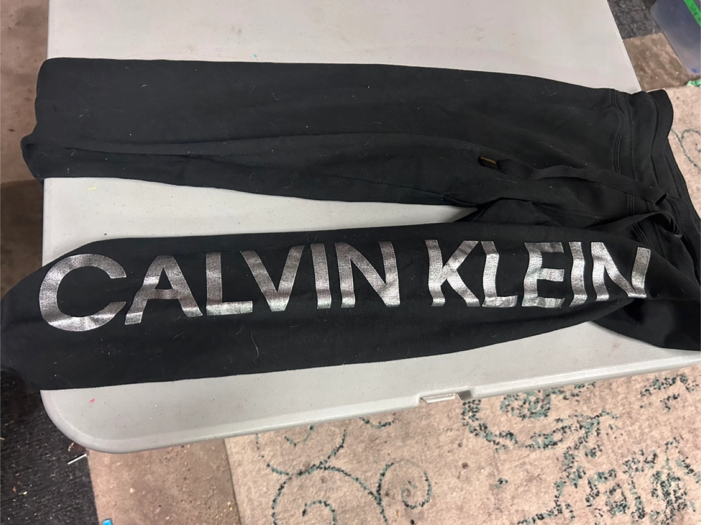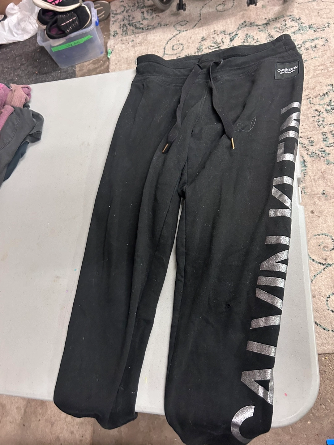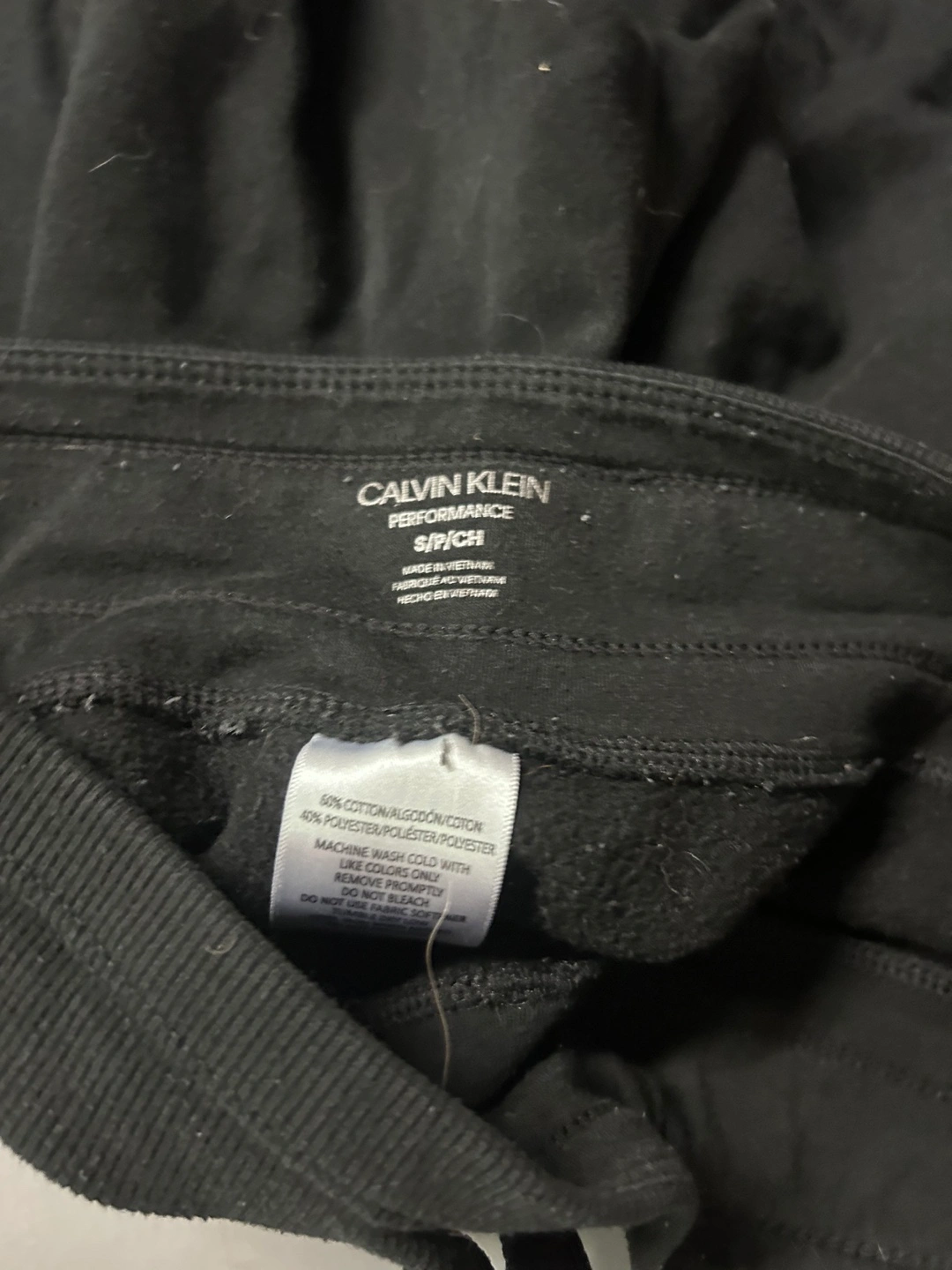 Selling a pair of Calvin Klein Performance black joggers in size small. The brand name is printed down the side of one leg.