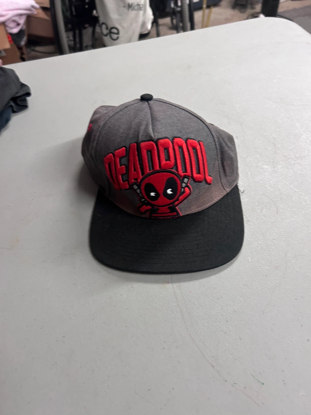 Selling a Deadpool baseball cap. It's grey and black with the Deadpool logo on the front. Perfect for any Marvel fan!