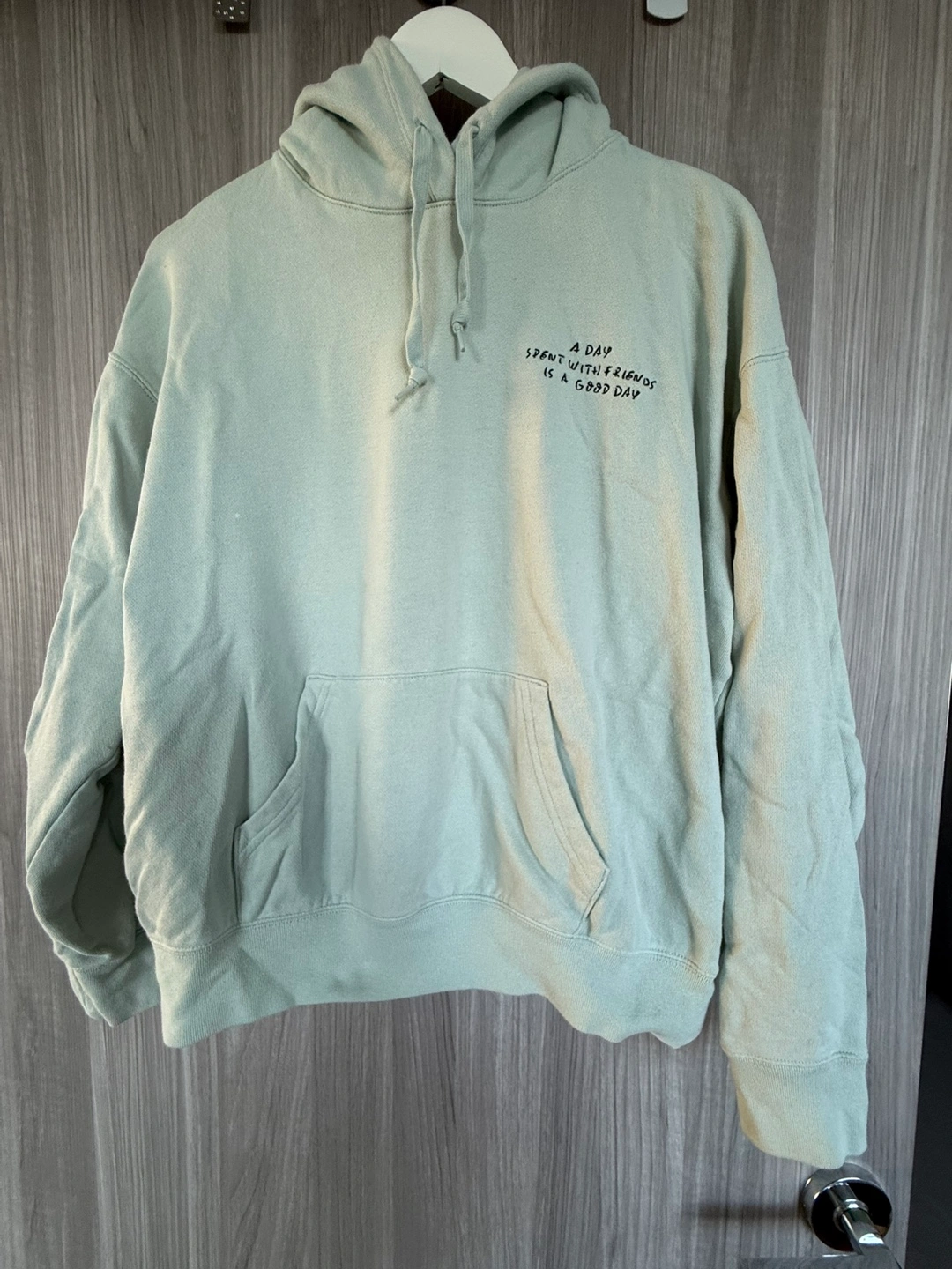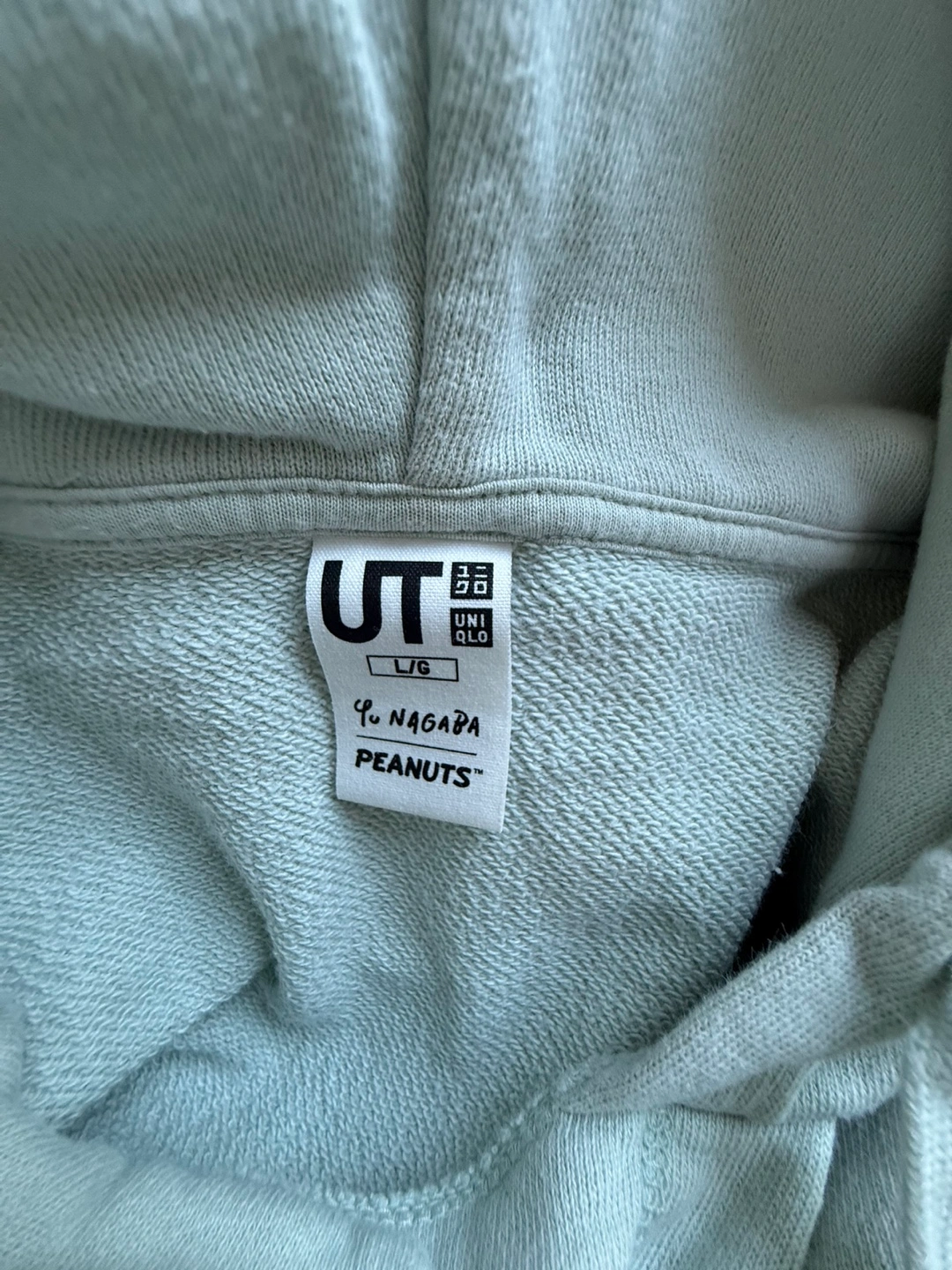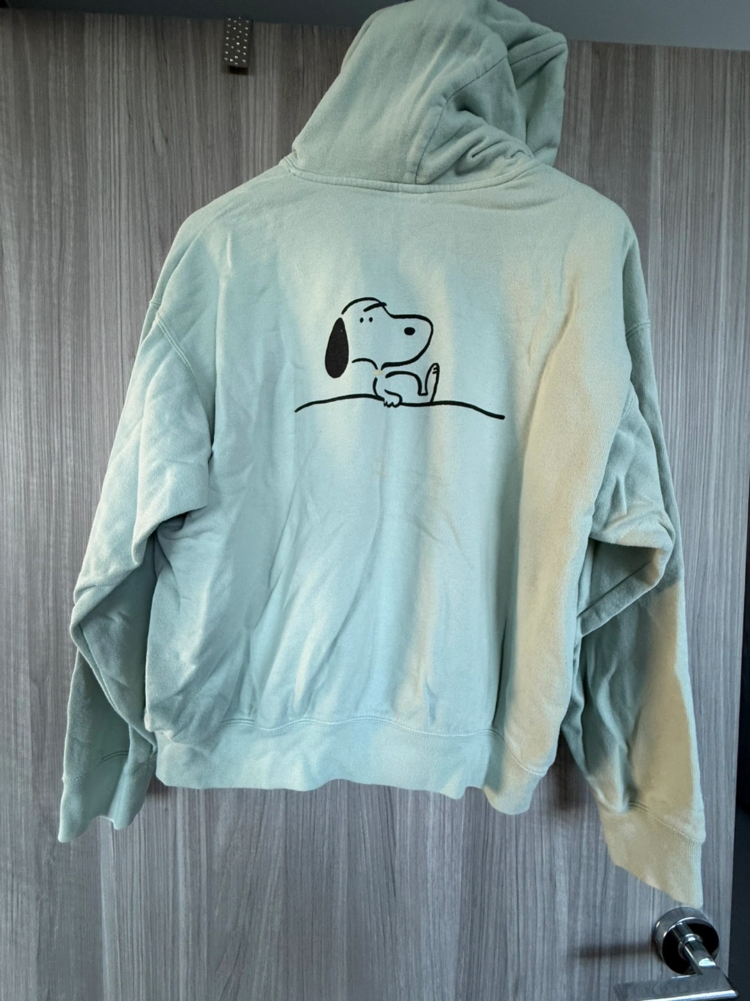 23Cozy Uniqlo hoodie featuring a cute Snoopy design by Yu Nagaba! It's a size L and in great condition. The hoodie is a light green colour and features the text "A DAY SPENT WITH FRIENDS IS A GOOD DAY" on the front