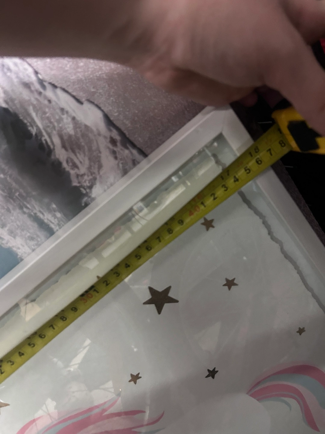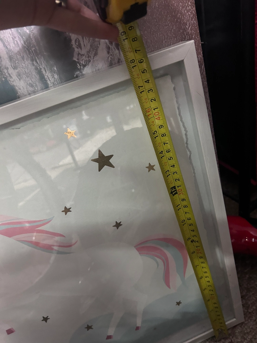 Cute unicorn-themed wall art, perfect for a kid's room or nursery! The frame is approximately 18x18 inches. It features a white frame with a unicorn and star design on the print.