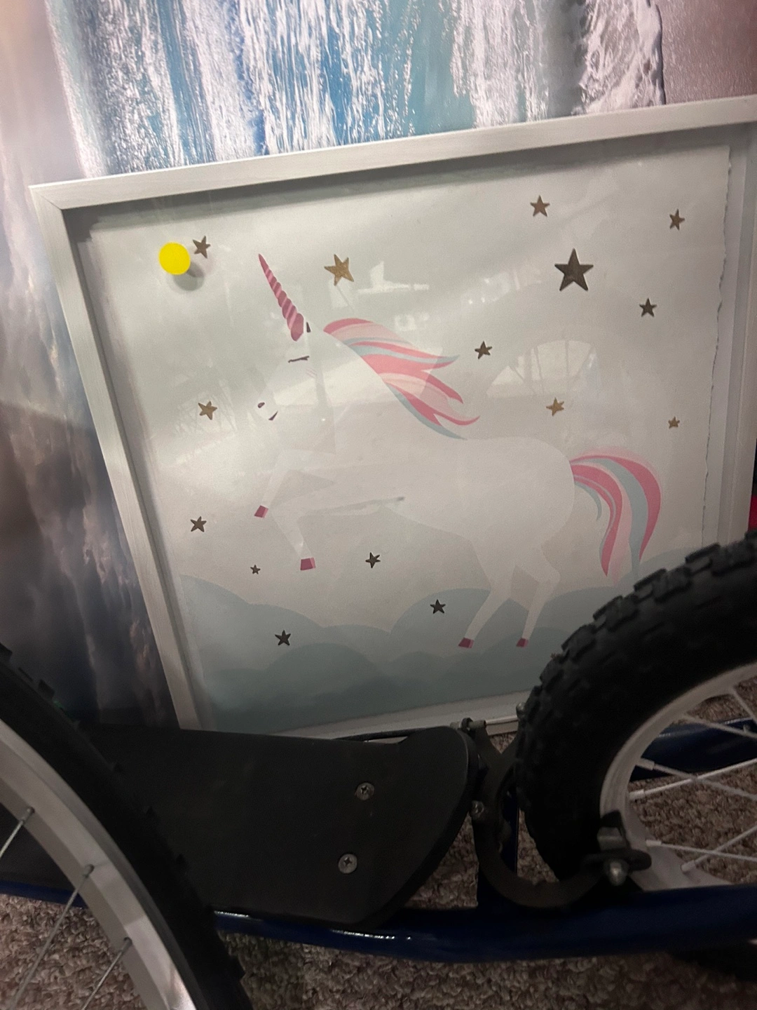 Cute unicorn-themed wall art, perfect for a kid's room or nursery! The frame is approximately 18x18 inches. It features a white frame with a unicorn and star design on the print.