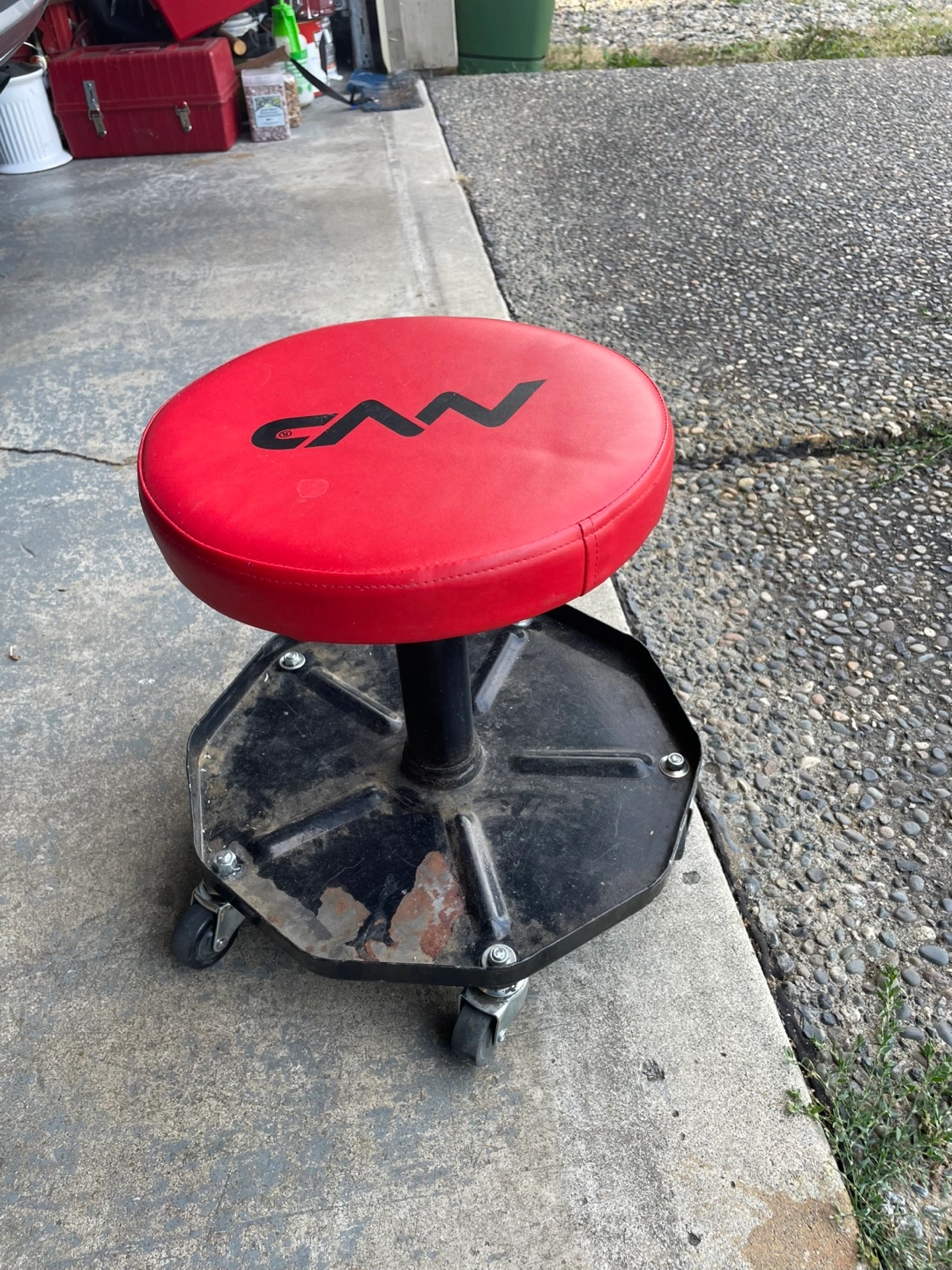 Selling a red rolling shop stool. It's got a black base and a comfy red seat. Perfect for your garage or workshop! It is adjustable in height.