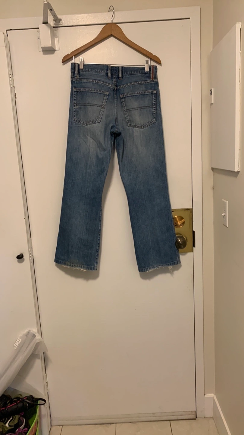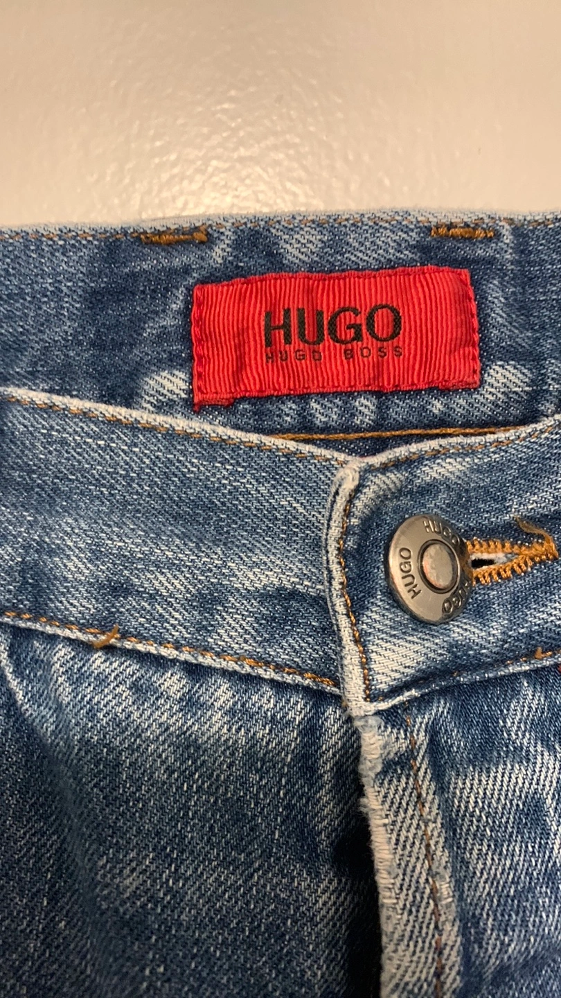 Selling a pair of Hugo Boss jeans. They are size 32 and made of 100% cotton. They have a stylish, slightly worn look.
