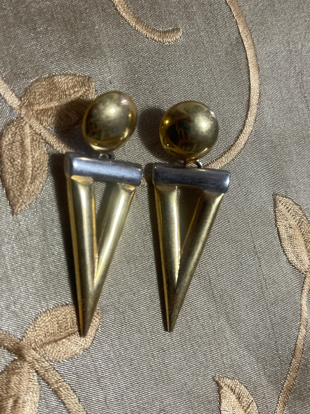 Selling a pair of stylish gold-tone triangle drop earrings. These earrings feature a unique design with a round top and a triangular drop, perfect for adding a touch of elegance to any outfit. They appear to be in good condition!