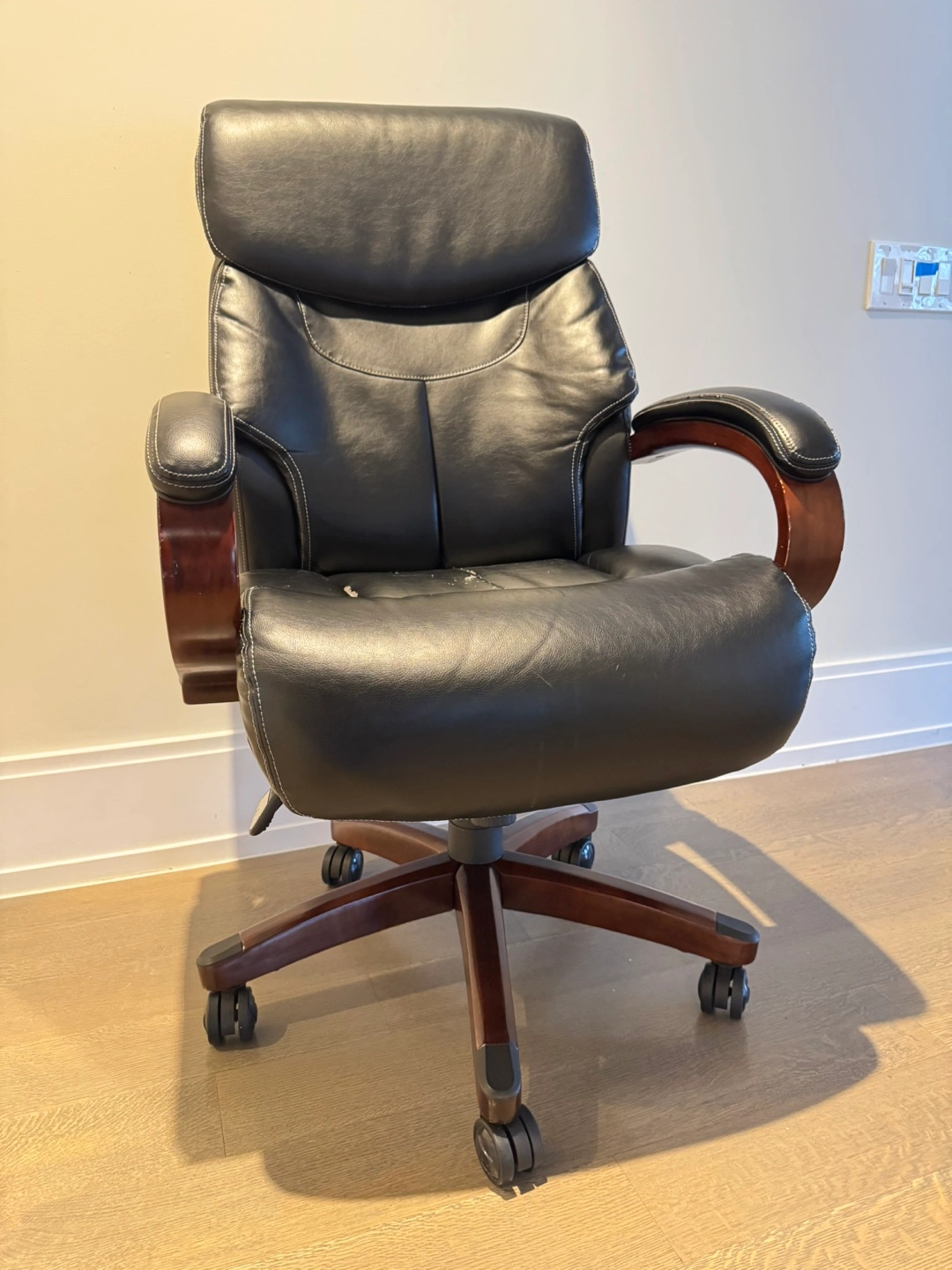 Selling a comfortable black leather executive office chair. It has a classic design with wood armrests and a sturdy base. Perfect for a home office or workspace!