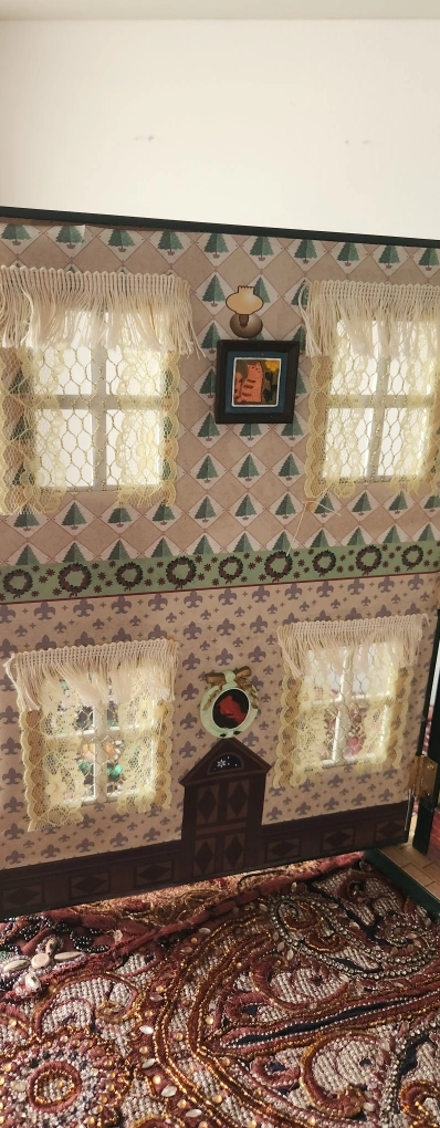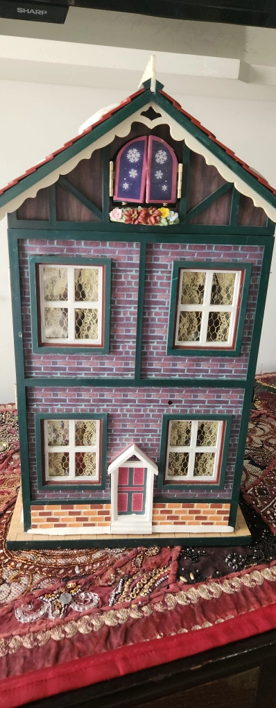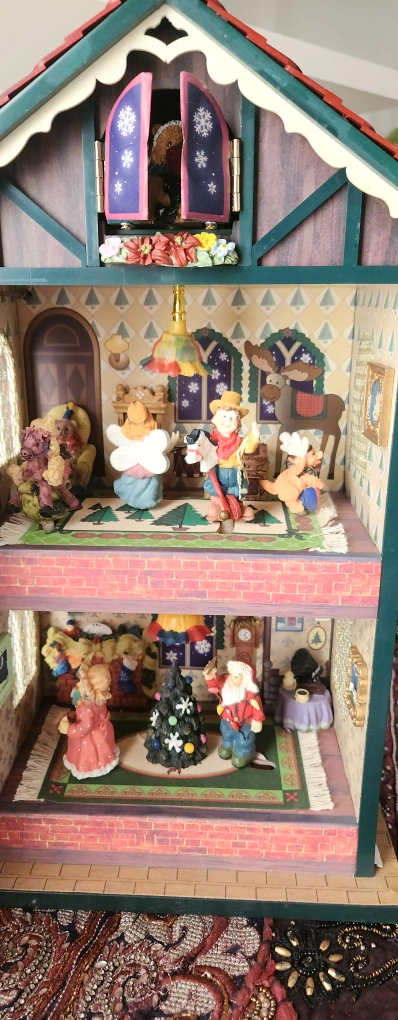 This is a charming musical Christmas dollhouse. It's in great shape and would make a lovely addition to your holiday decor. The dollhouse features multiple levels and detailed miniature scenes with figurines. It plays music, adding to the festive atmosphere