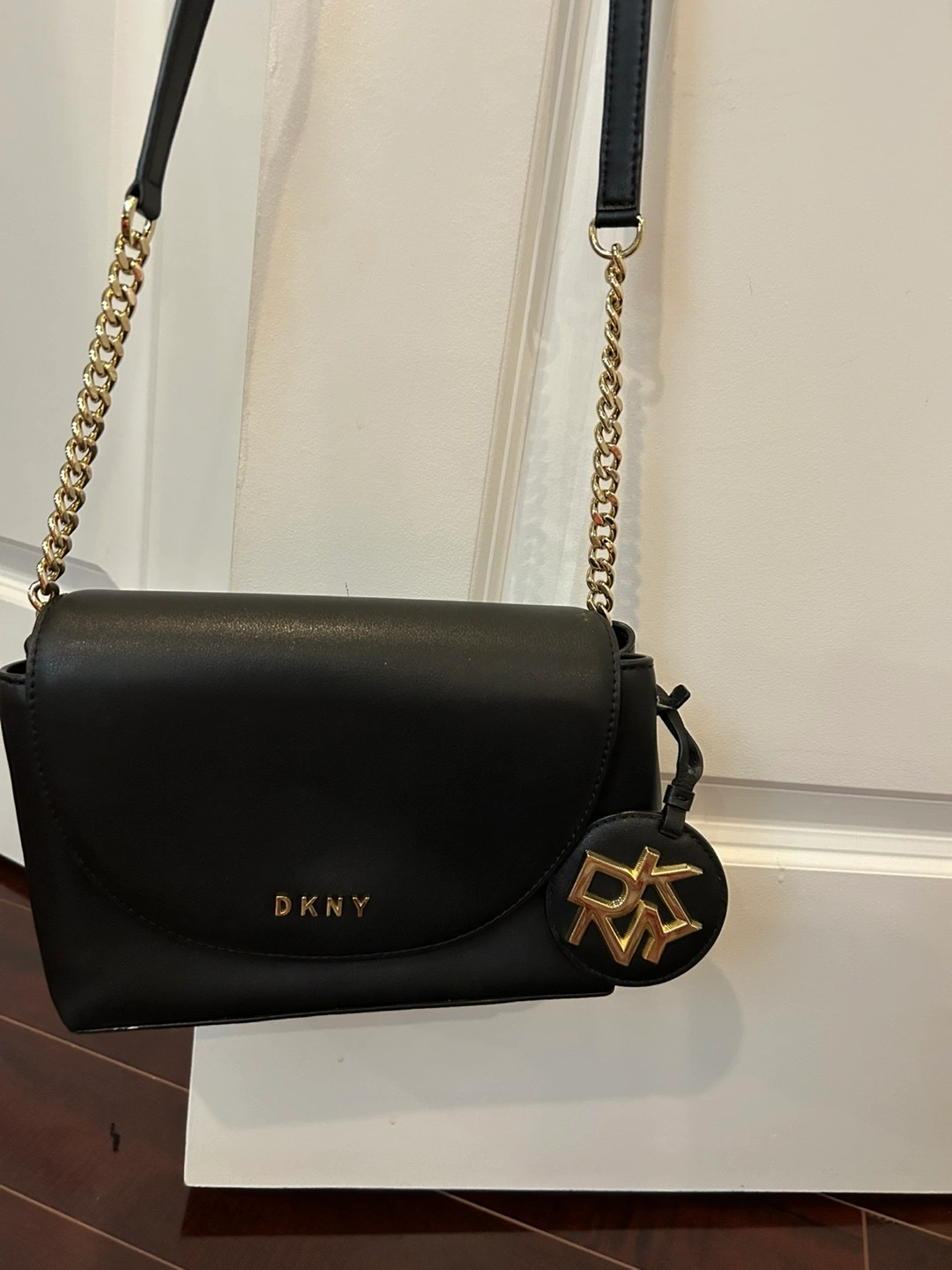 Selling a stylish DKNY crossbody bag in black! It's in great shape and features a chic gold chain detail on the strap. Perfect for adding a touch of elegance to any outfit. The bag has a sleek design and is just the right size for your essentials