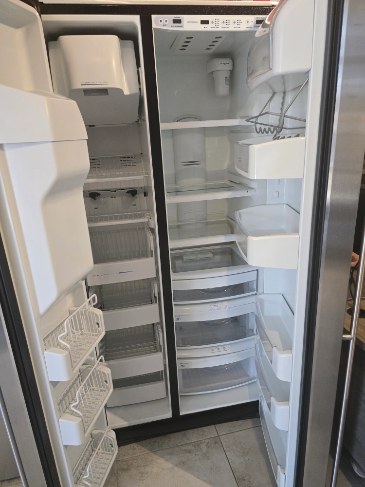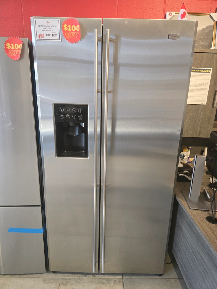 Selling a GE Monogram side-by-side refrigerator. It features a water and ice dispenser on the door. The interior is spacious with adjustable shelves and drawers. Great for any kitchen!