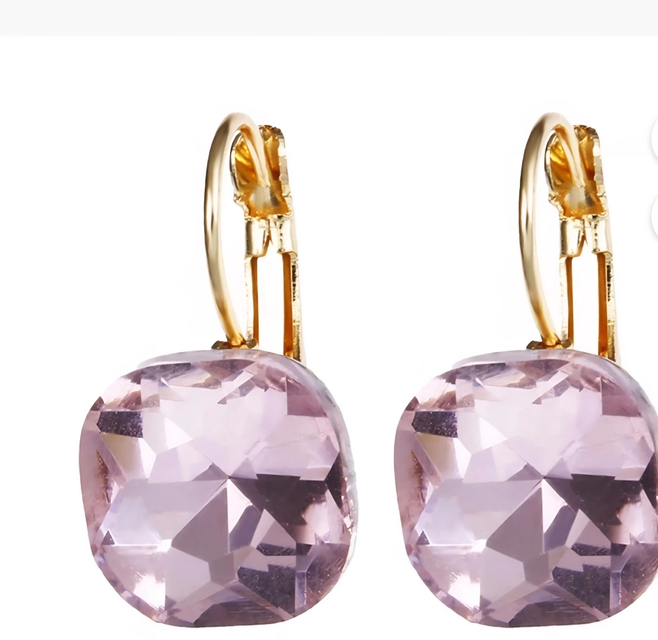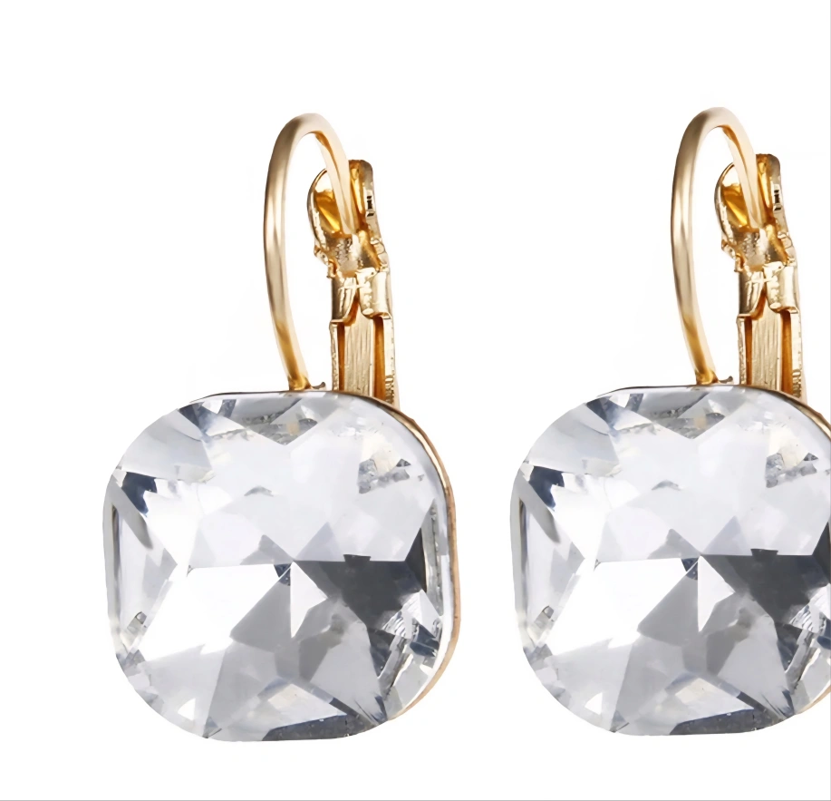 These are a pair of crystal drop earrings with a gold-tone finish. They're perfect for adding a touch of sparkle to any outfit! Available in pink, blue, and clear.