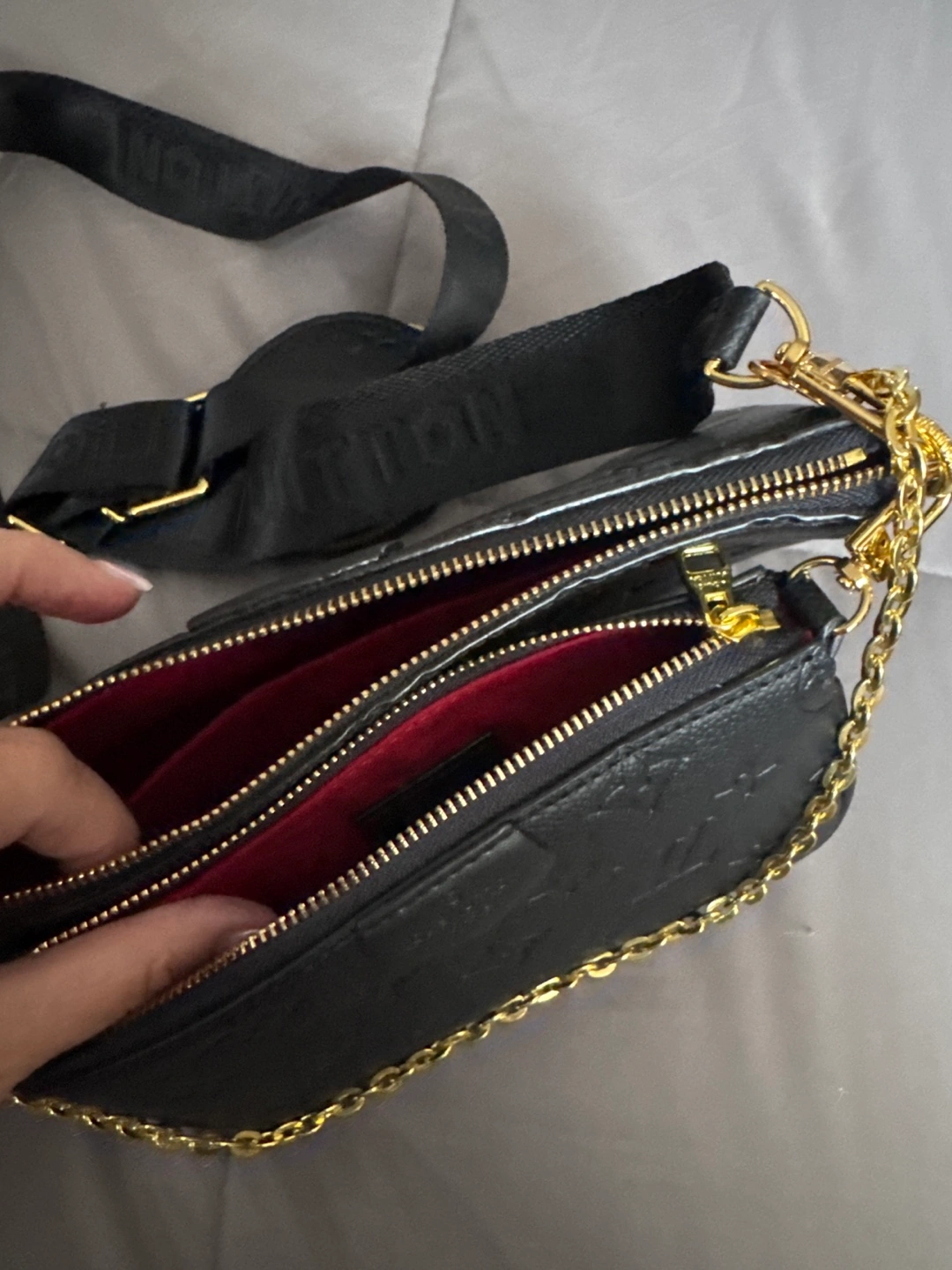This is a Louis Vuitton REPLICA Multi Pochette Accessoires in black. It comes with the original dust bag. The bag features a detachable round coin purse and a detachable, adjustable strap for versatile wear. It has a gold chain that is removable