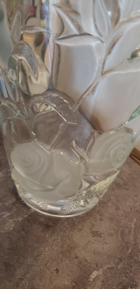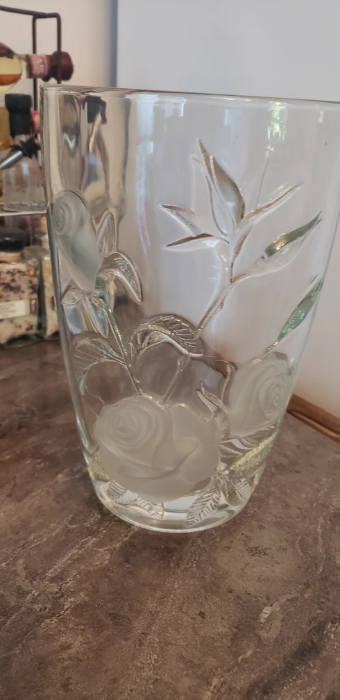 Selling a lovely clear glass vase with a floral design. It's in great shape and would look beautiful with fresh flowers or as a standalone decorative piece for your home!