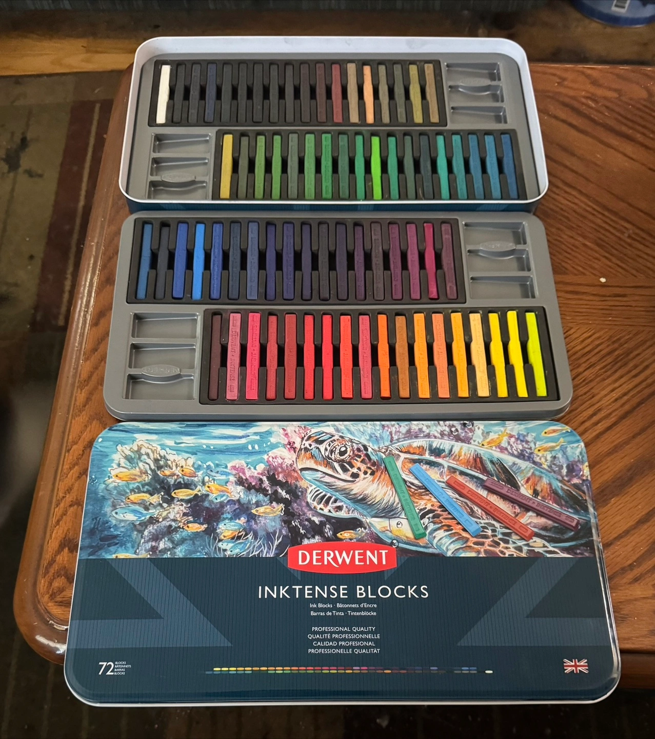 Derwent Inktense Blocks 72 Tin, Set of 72, 8mm Block, Soft Texture, Watersoluble, Ideal for Watercolour, Drawing, colouring, Crafts and Painting on Paper and Fabric, Professional Quality (2301980)