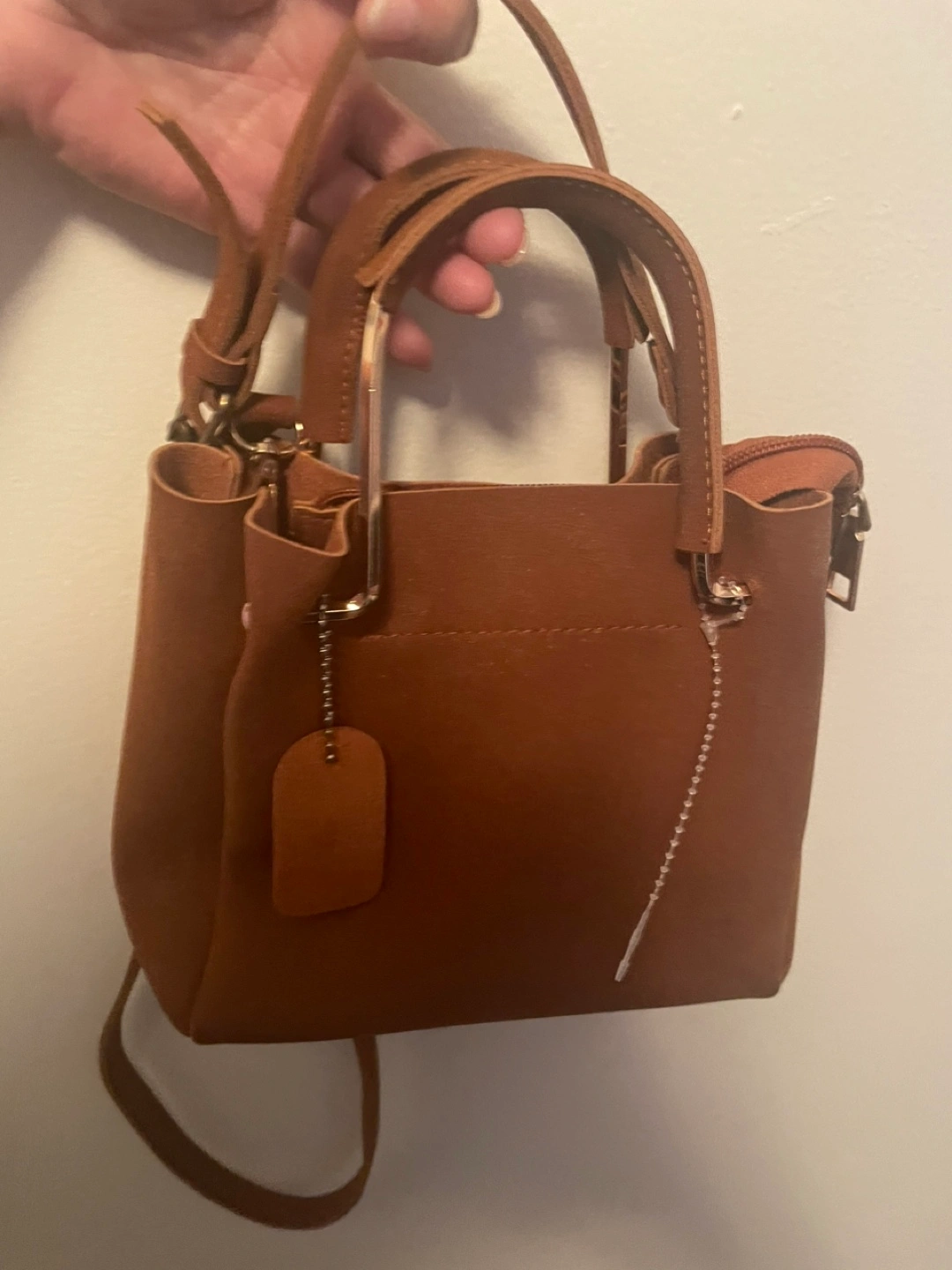 A cute brown handbag with a shoulder strap is up for grabs! It features a zippered top and a structured design. Perfect for everyday use or a night out.