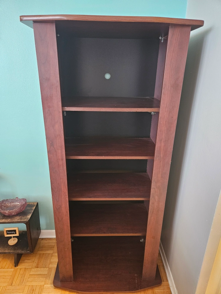 Was a media tower with the top shelf having a hole in the back. I used it to store cook books and cook/dinner ware.