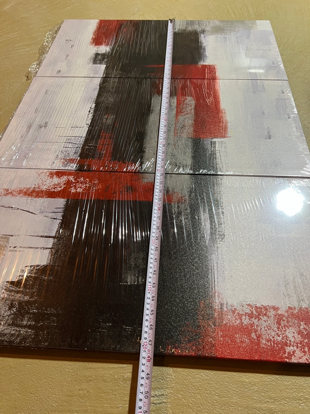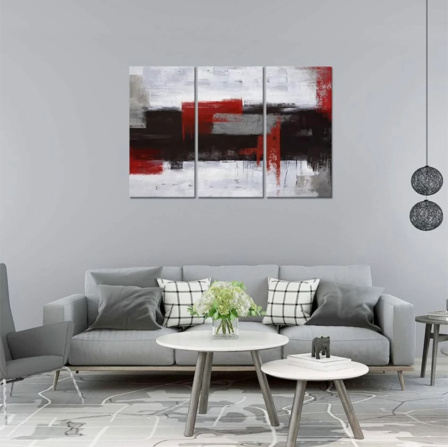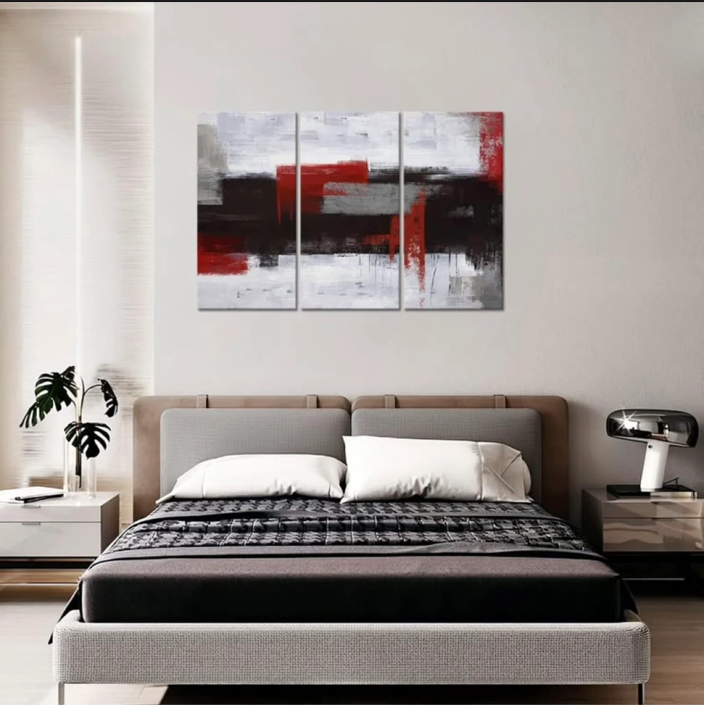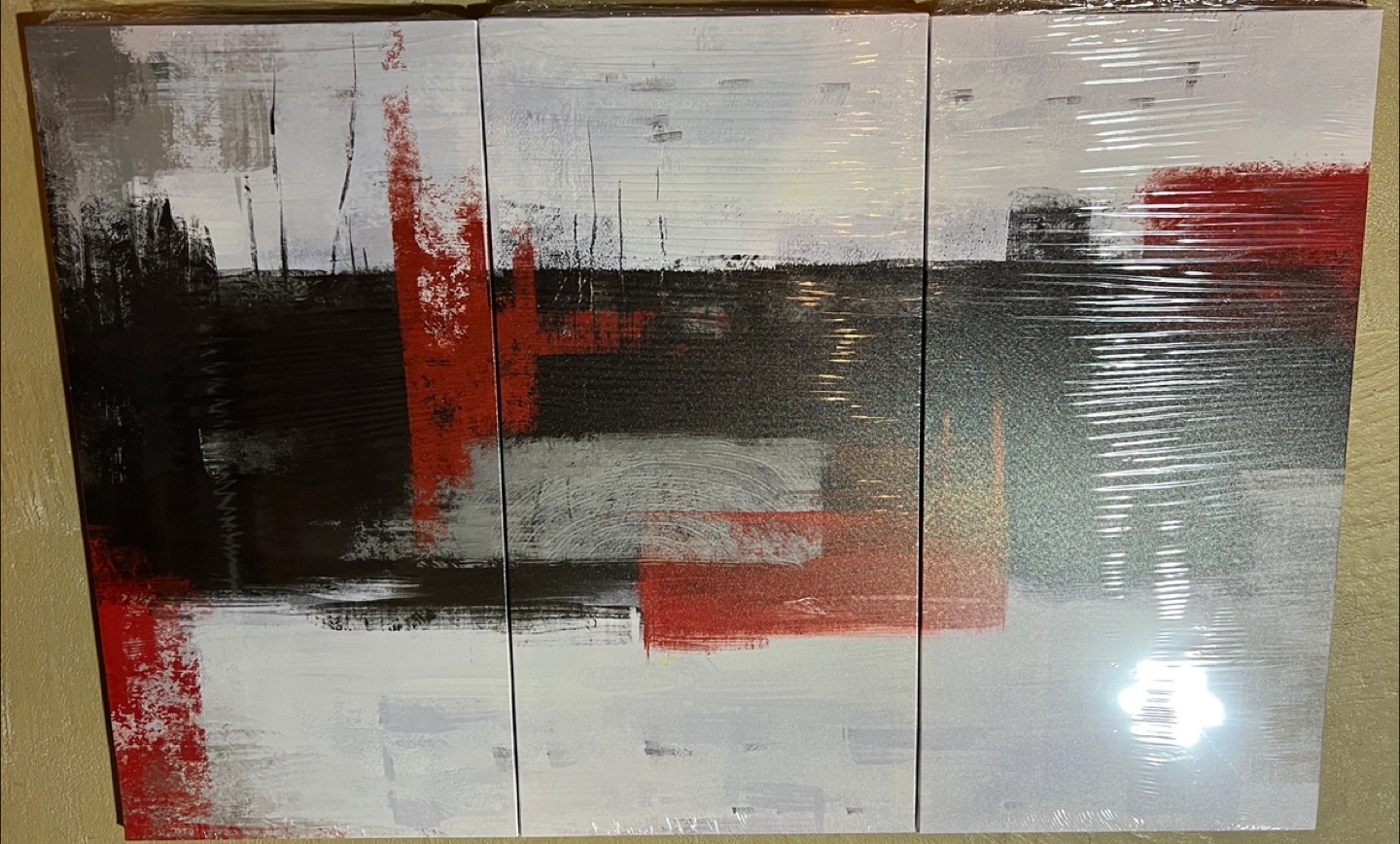 Selling a set of three abstract canvas wall art panels. The artwork features a modern design with strokes of red, black, grey, and white. Each panel is individually wrapped and ready to hang, perfect for adding a touch of contemporary style to your home or office Serious inquiries only please Pick up at Britannia and tenth line Mississauga