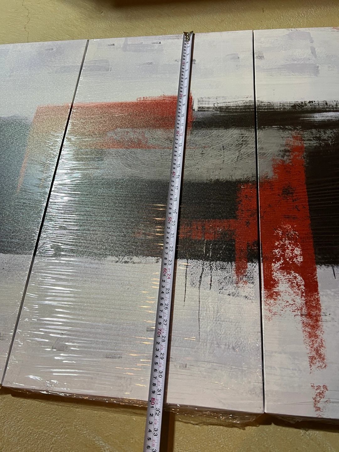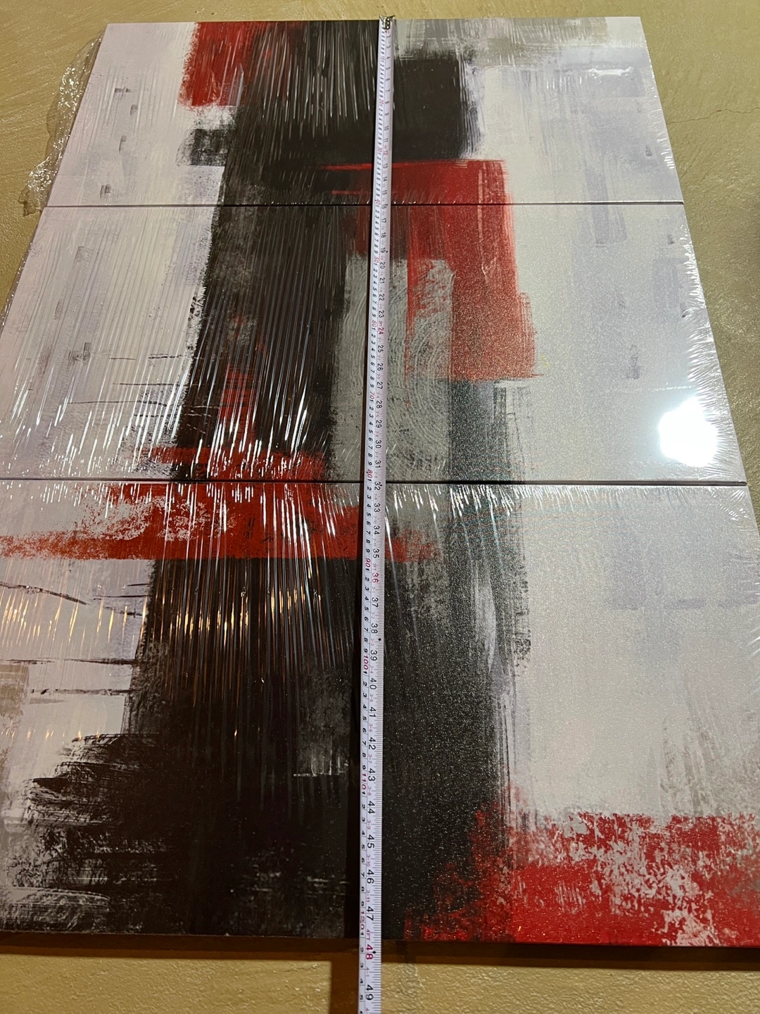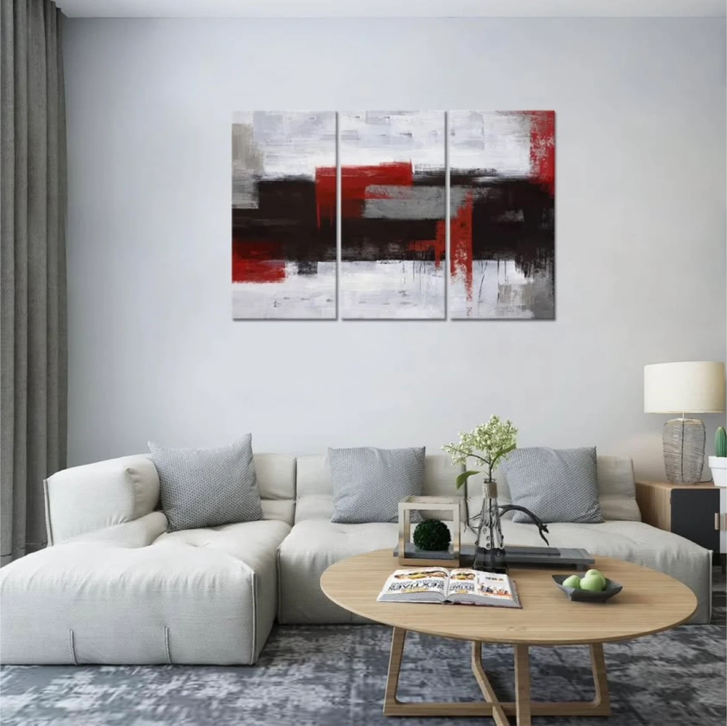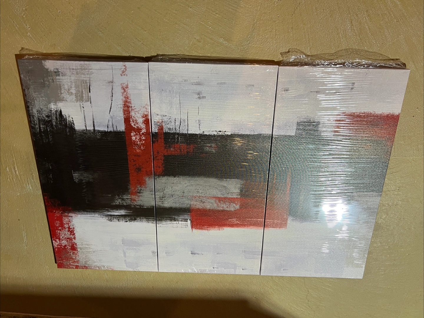 Selling a set of three abstract canvas wall art panels. The artwork features a modern design with strokes of red, black, grey, and white. Each panel is individually wrapped and ready to hang, perfect for adding a touch of contemporary style to your home or office Serious inquiries only please Pick up at Britannia and tenth line Mississauga