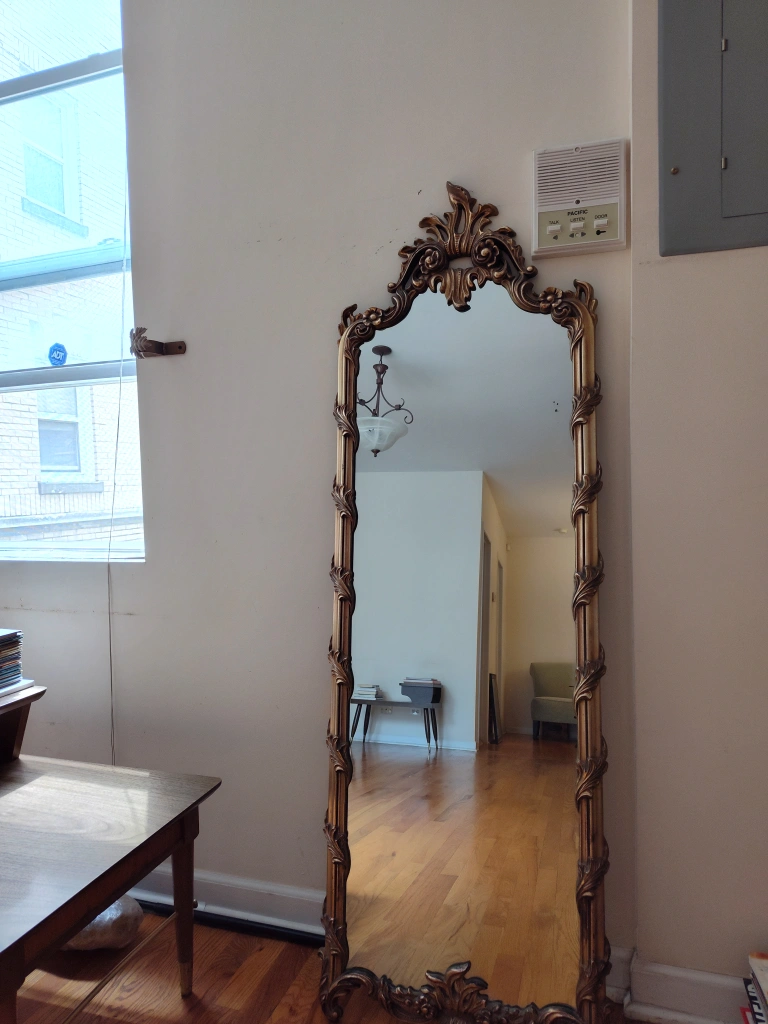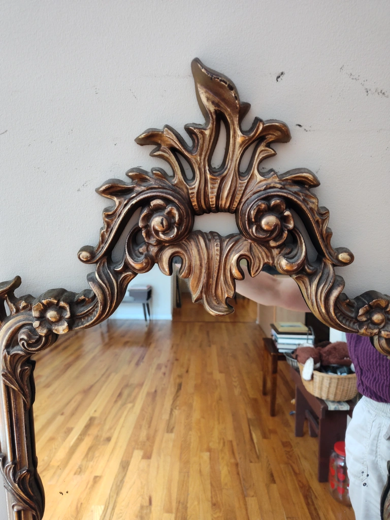 Selling a beautiful, ornate vintage full-length mirror with a gold frame.