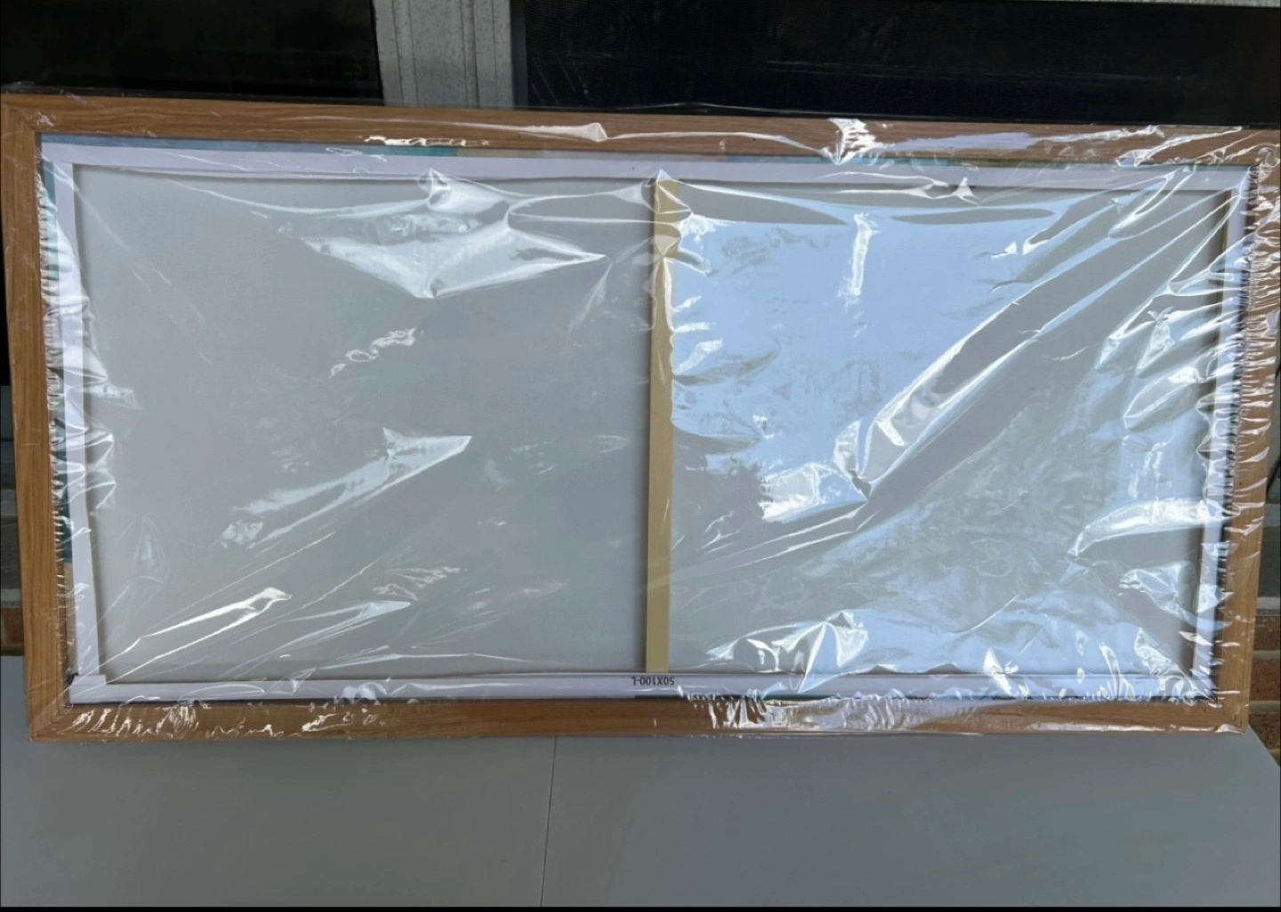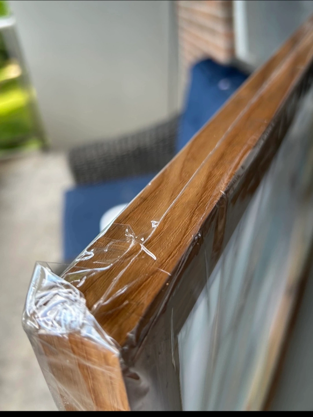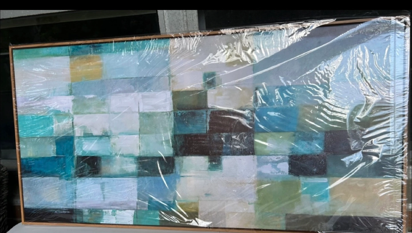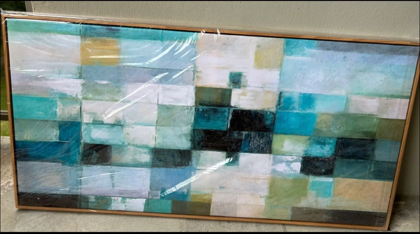 276Brand new, sealed. Ready to hang. High quality, beautiful abstract canvas wall art. Features blues, greens, and neutrals. Framed in wood Price Firm. Leslie/Hwy 401