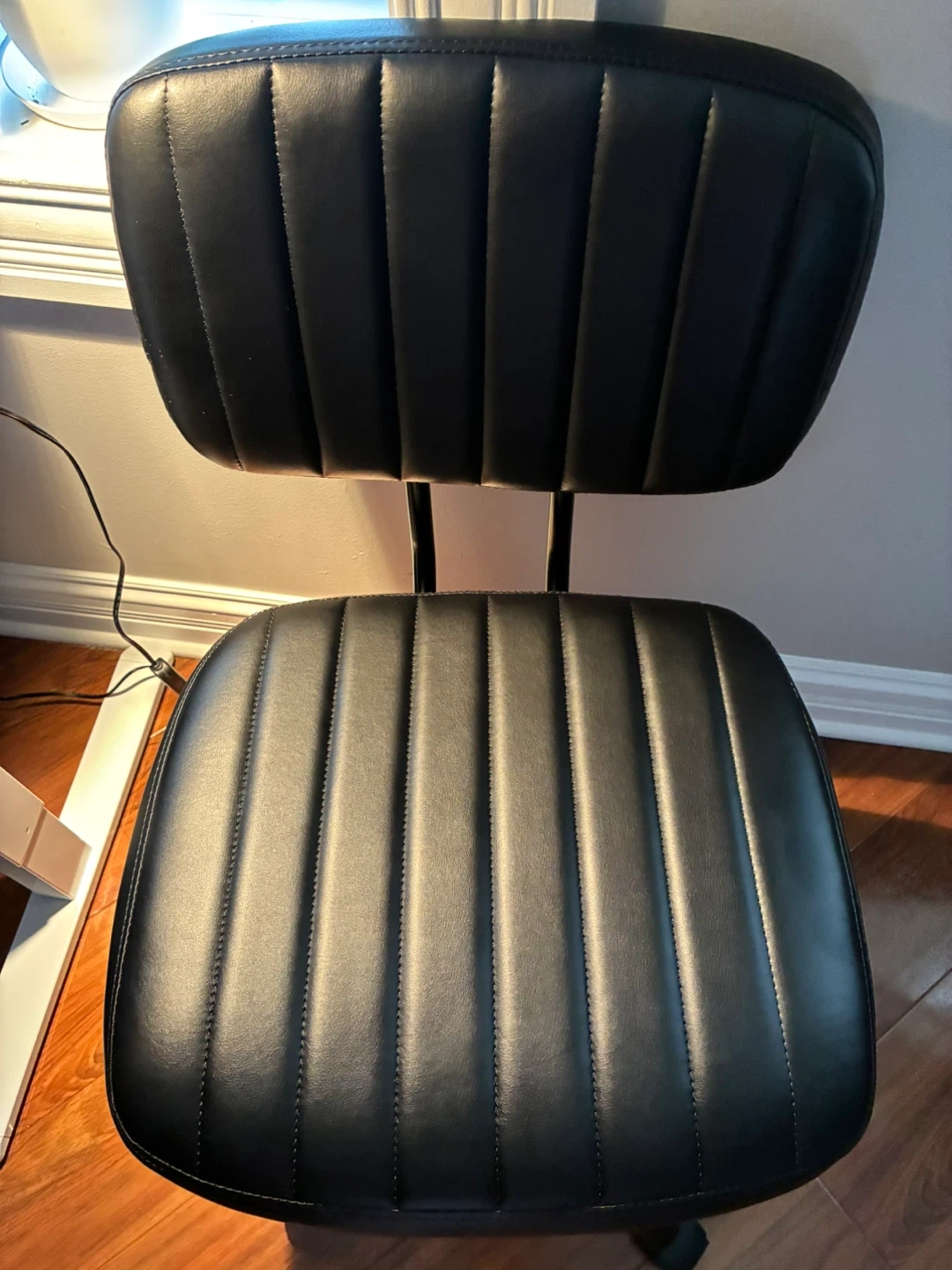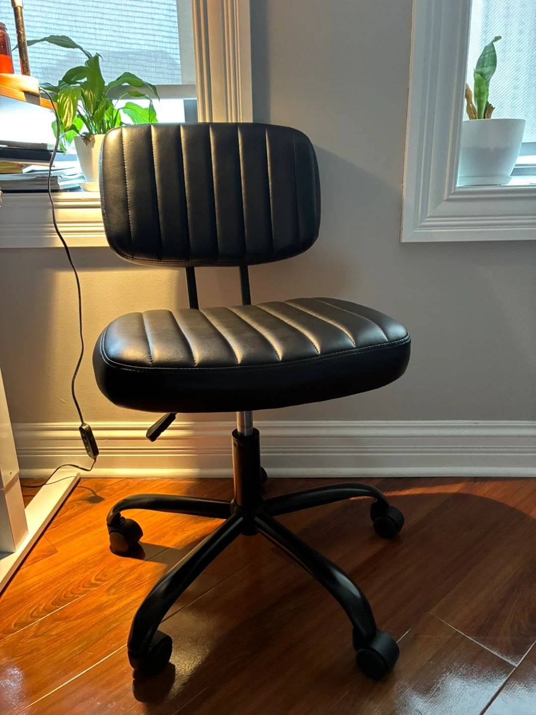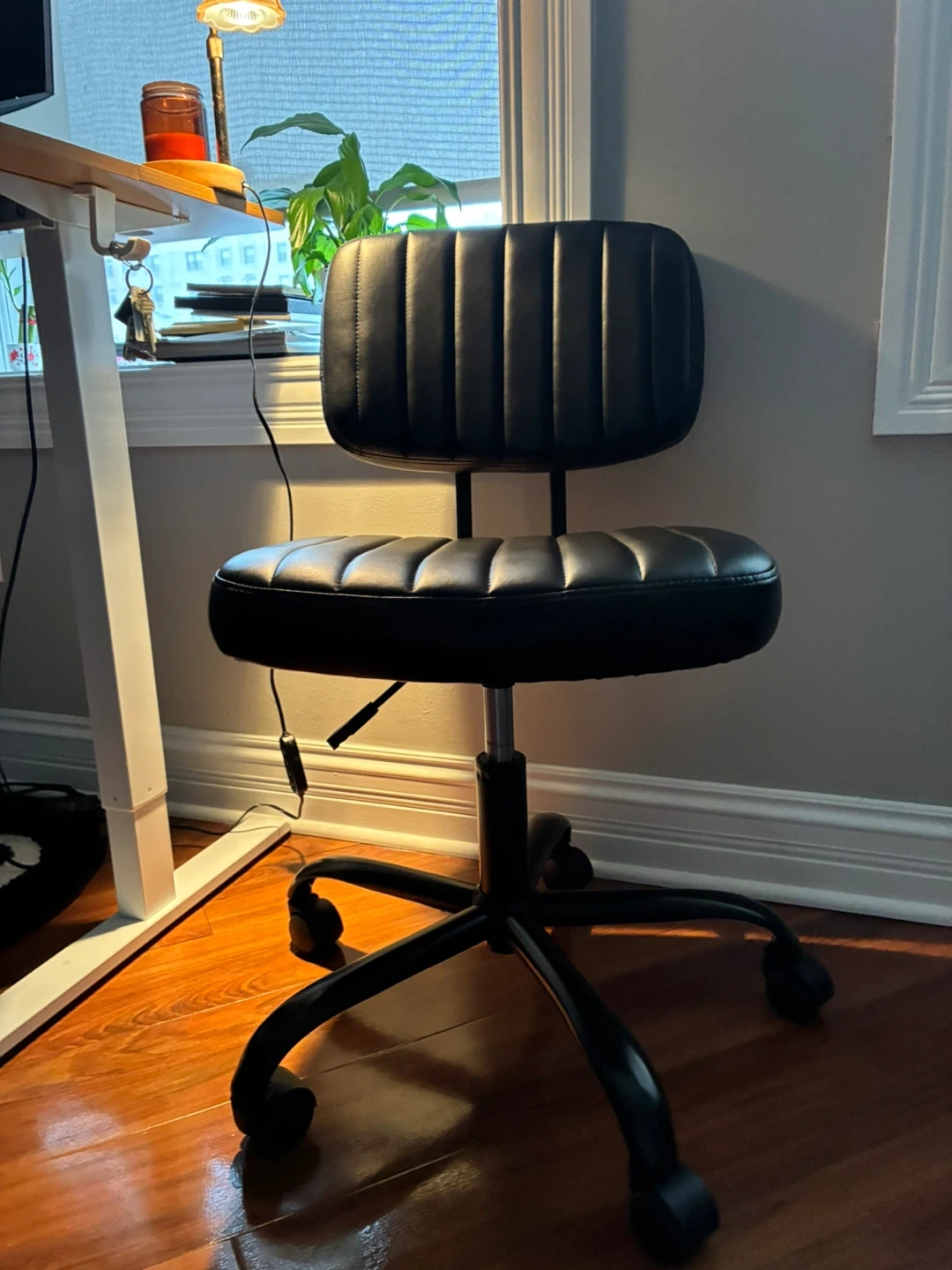 This is a black rolling desk chair with a cushioned seat and back. It features a five-wheel base for stability and easy movement. The chair's height is adjustable. It’s brand new and has never been used.