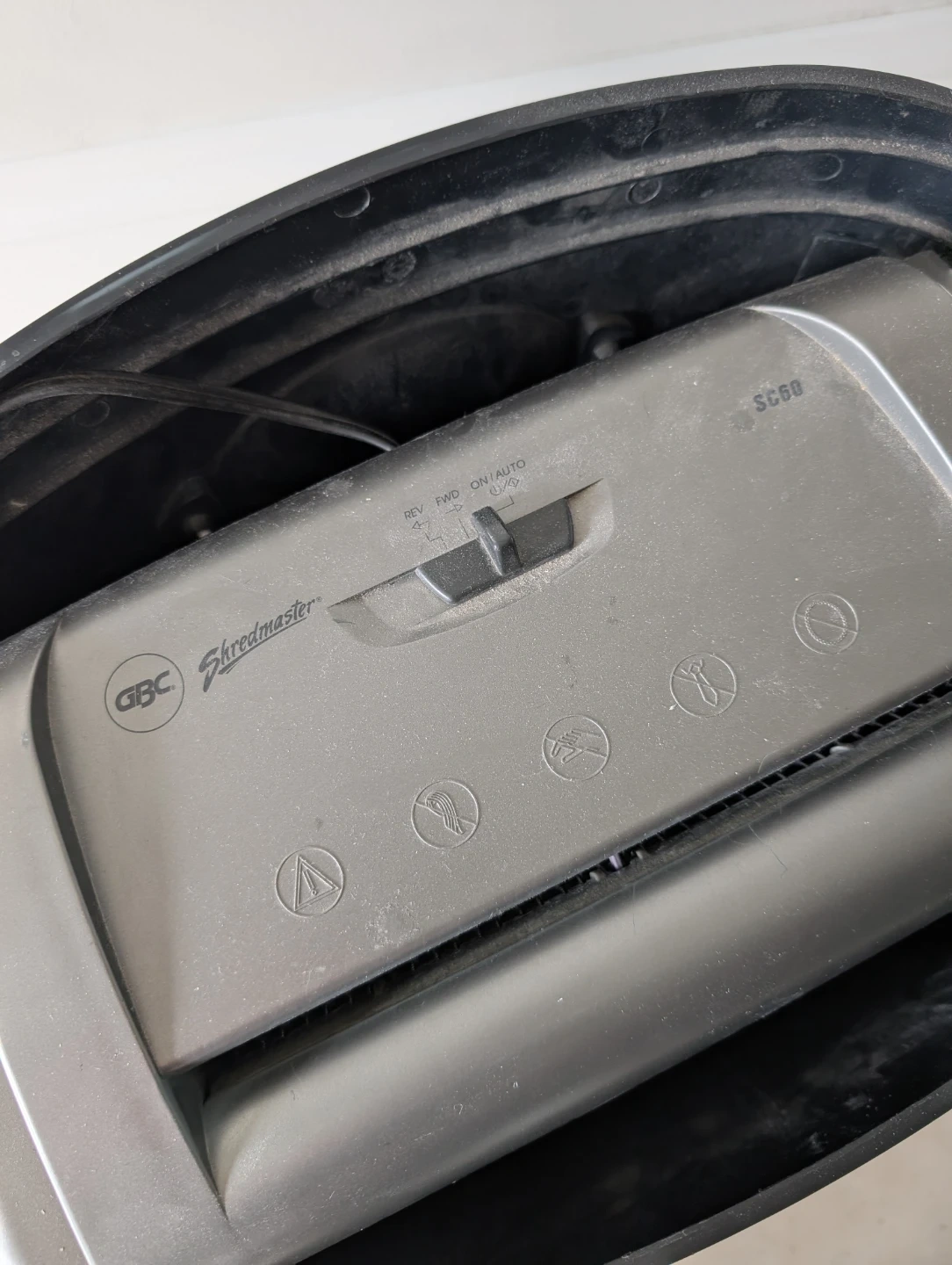GBC Shredmaster SC60 crosscut paper shredder. It's a 16-sheet capacity shredder, perfect for home or office use. The unit has a handle for easy lifting and a large bin for shredded paper. It's a reliable way to dispose of sensitive documents securely!