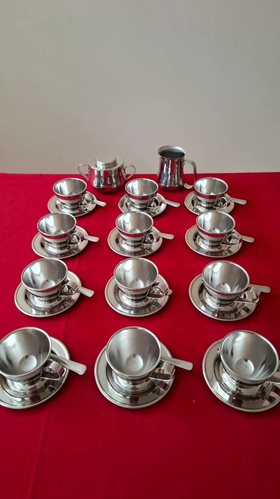 232Selling a stainless steel espresso set. Includes 12 cups, 12 saucers, 12 spoons, a sugar bowl, and a creamer. Like new.