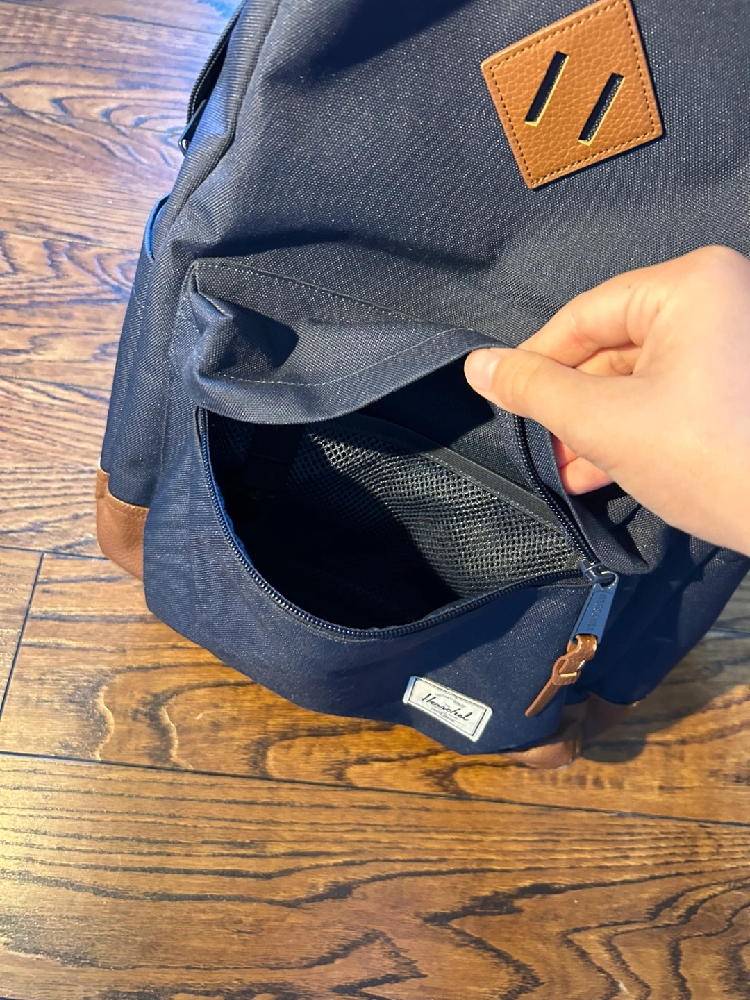 Selling a Herschel backpack in navy blue with a brown leather bottom. There's some wear and tear on the leather at the bottom, as shown in the photos, but otherwise, it's in great condition! Great for school or everyday use. The only reason I’m selling is because I need a bigger one for back to school.