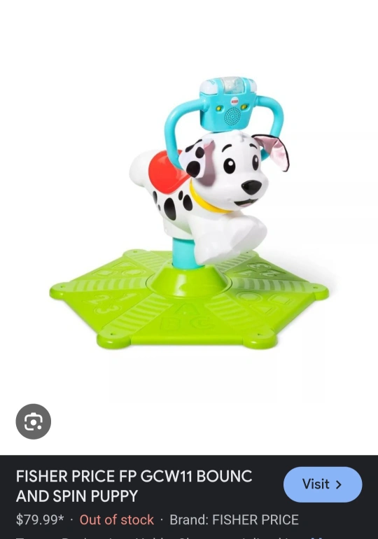 I'm selling a Fisher Price Bounce and Spin Puppy! It's in great condition and ready for a new home. Originally bought for $79.99, this toy is perfect for keeping your little one entertained and active. It features a fun bouncing and spinning action, along with lights and sounds to stimulate your child's senses.