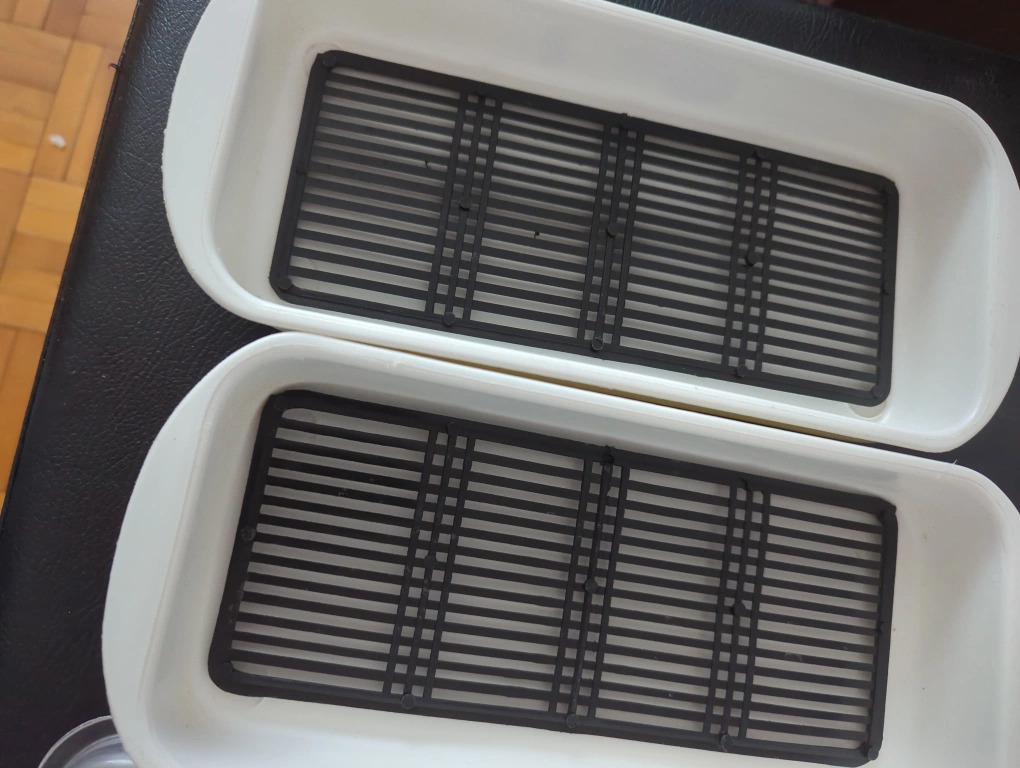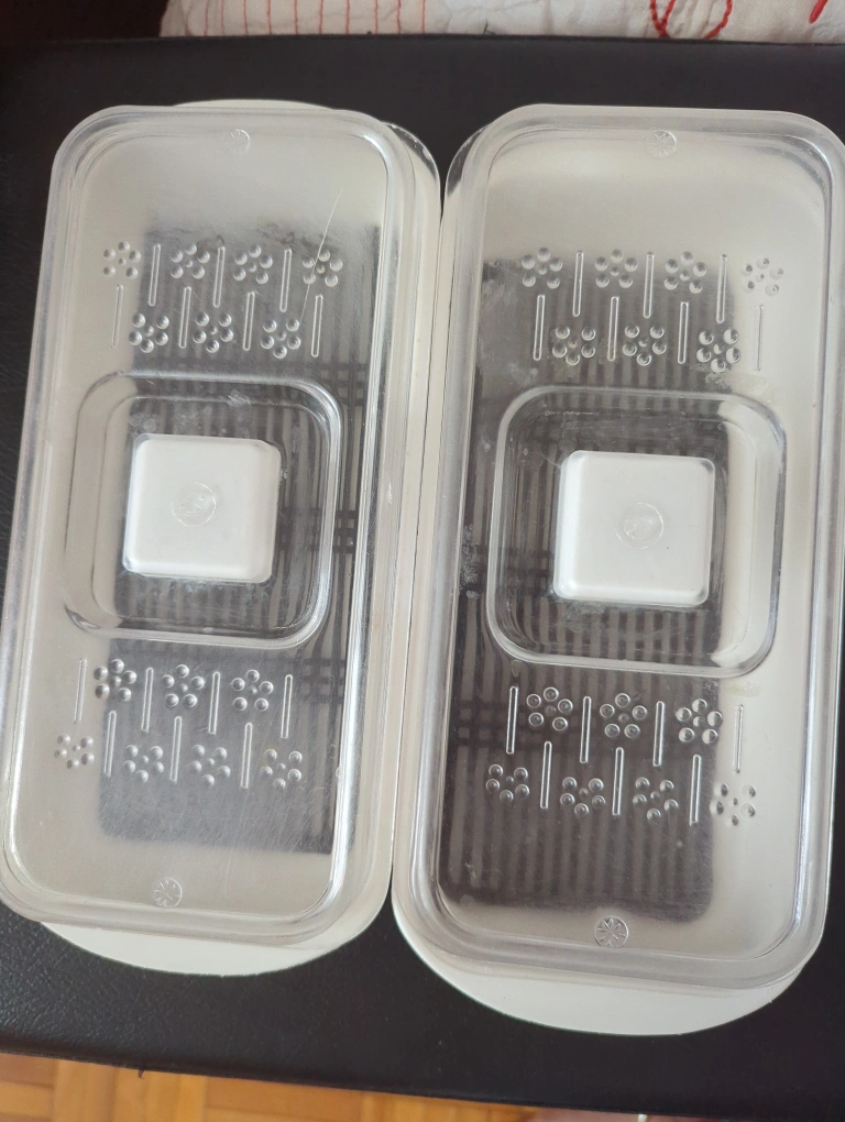 I'm selling a set of two food containers. They're white with a black grate inside. Perfect for storing leftovers or meal prepping!