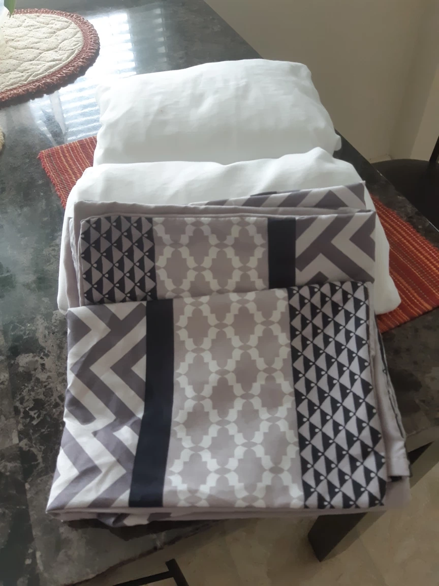 Selling white single bed sheet set, fitted and flat, with 2 geometric pattern pillow cases. The colour scheme is neutral, featuring shades of grey and white. $8.00 FINAL price, can't go any Less