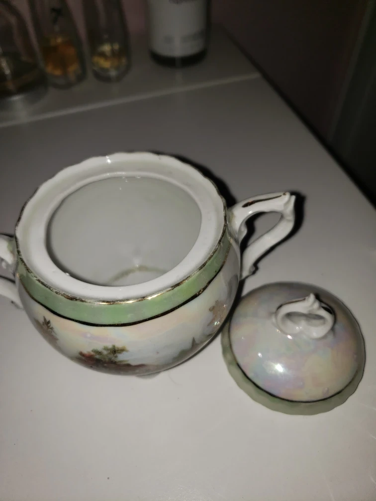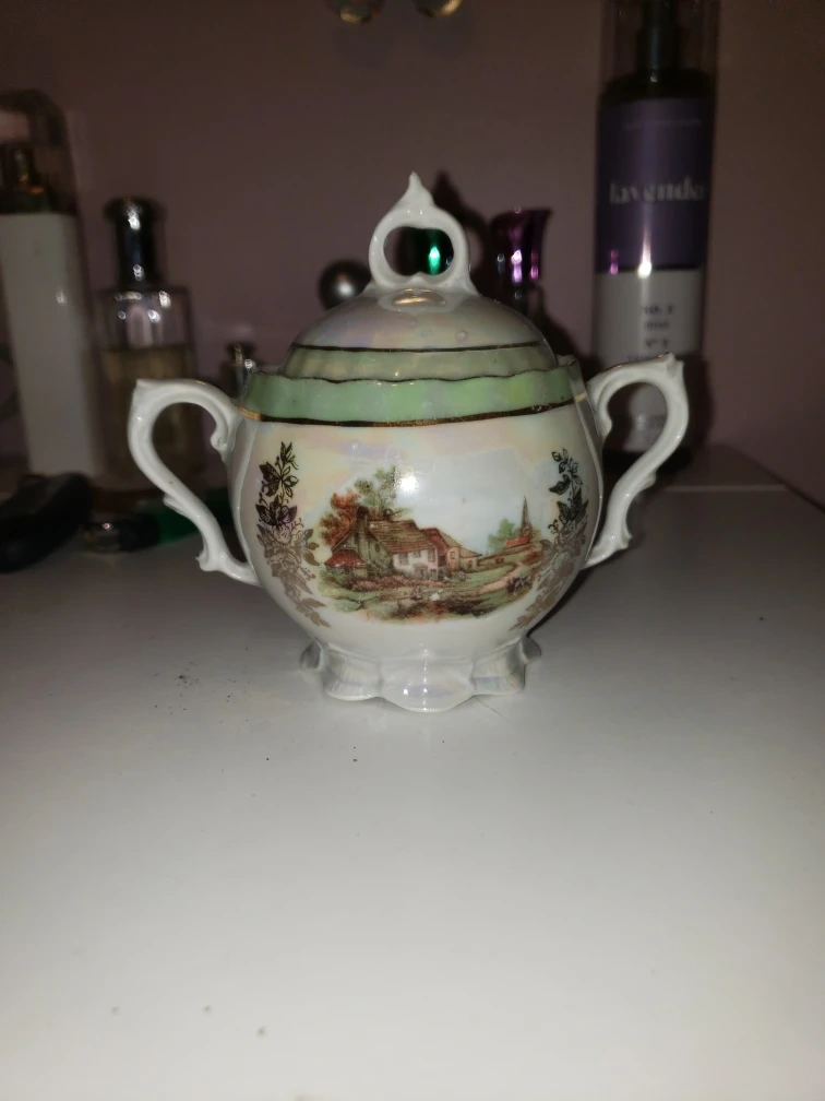 Selling a vintage sugar bowl. It has a beautiful iridescent finish and a charming design featuring a landscape scene. It would make a lovely addition to any tea set or kitchen cottage core decor. Lighter for scale.